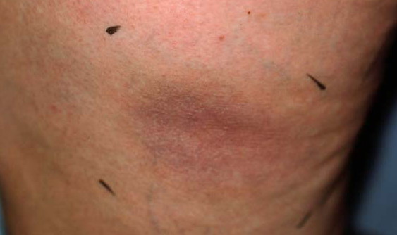 In rare instances, lesions of lupus panniculitis have been described in the subcutaneous fat of the breast (“lupus mastitis”), orbital fat, and periparotid fat tissue. An isomorphic phenomenon is frequently seen in patients with lupus panniculitis; subcutaneous erythematous nodules often develop or recur at the sites of trauma, injection, and biopsy.