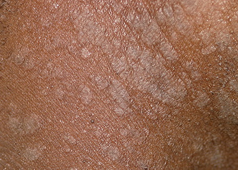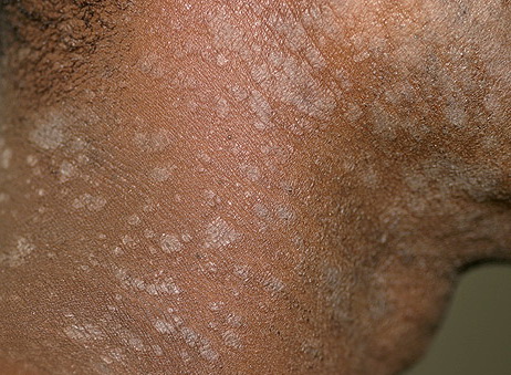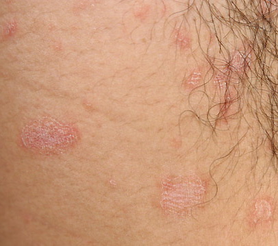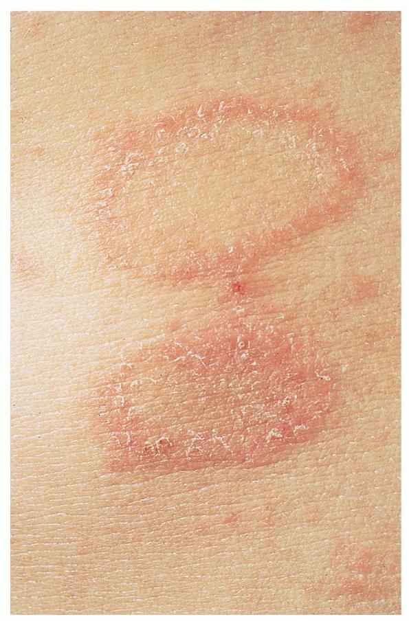 Secondary syphilis may present with slightly scaly lesions and can mimic papular PR with no primary plaque. Mucosal lesions and lymphadenopathy may occur in both PR and syphilis, but as with involvement of the palms and soles, these findings are much more common in the latter. Serologic tests for syphilis will differentiate the two. Tinea corporis may resemble PR, especially when PR occurs as only a primary plaque or when it is localized to the groin area. Scaling will be at the periphery of the plaques in tinea corporis as opposed to inside the periphery of plaques in PR. Mycologic investigation is often necessary to rule out dermatophyte infection. The lesions of nummular dermatitis are usually round, not oval, and pinpoint papules and vesicles are more prominent than in PR. Guttate psoriasis may cause difficulties in diagnosing PR when only a few lesions are present, when lesions follow lines of cleavage, and when the disease course is chronic. Histologic examination may be useful in these cases. Pityriasis lichenoides chronica may present with a Christmas tree pattern on the trunk, but as a rule, typical lesions will be found on the extremities.