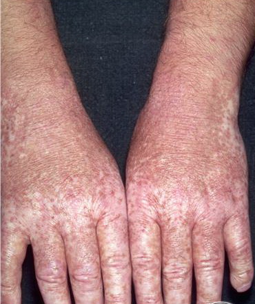 The face (especially the forehead, zygomatic area, and temples) and the neck are principally involved but the hands, forearms, and trunk can also be affected. Inflammatory findings such as erythema and pruritus are usually absent.