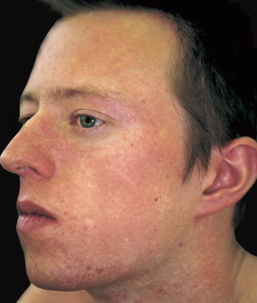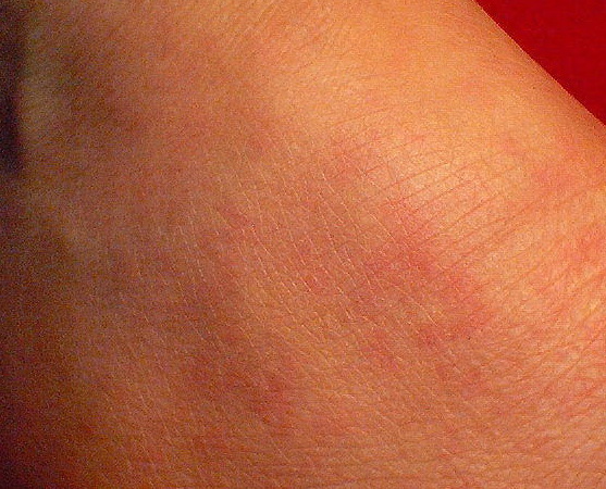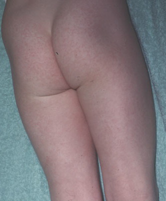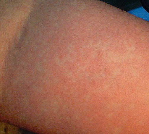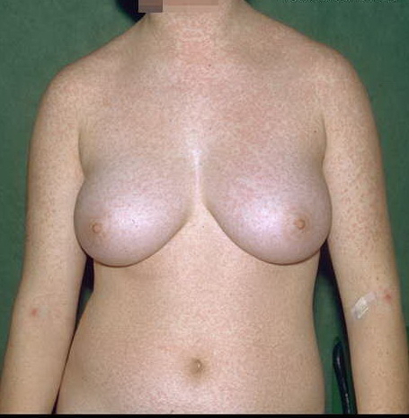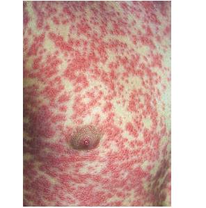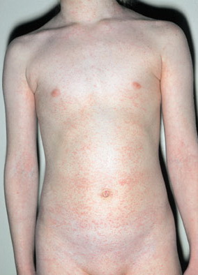 The exanthem, occurring 14 to 17 days after exposure, is characterized by pruritic pink to red macules and papules that begin on the face, quickly progressing to involve neck, trunk, and extremities (Fig. 192-4 and At a Glance image). Lesions on the trunk may coalesce, whereas those on the extremities often remain more discrete. The rash usually begins to disappear in 2 to 3 days, unlike rubeola, which can be more persistent and clears the head and neck first. Desquamation may follow resolution of the rash.