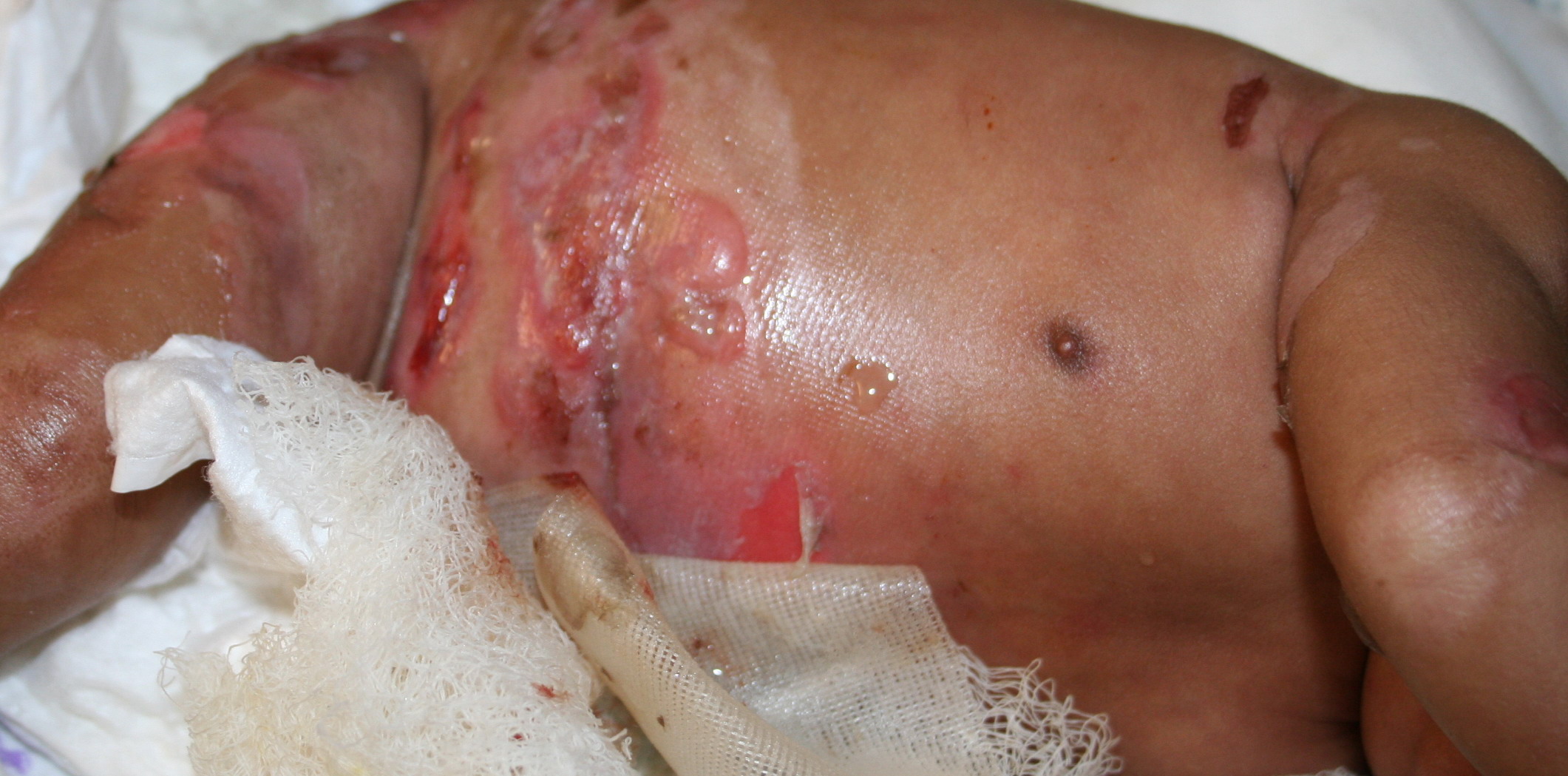 Prevention of infection is the preferred strategy. With extensive areas of crusting and denudation, a strict wound care regimen should be followed. Such a regimen entails regular whirlpool therapy followed by application of topical antibiotics. The wound should be covered with semiocclusive nonadherent dressings. Do not apply adhesive tape directly to the skin. Self-adhering gauze or tape is a better choice for keeping dressings in place.