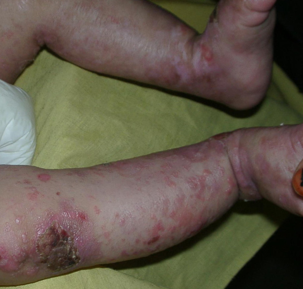 The Herlitz or letalis form of junctional epidermolysis bullosa is characterized by generalized blistering at birth and arises from an absence or a severe defect in expression of the anchoring filament glycoprotein laminin 5. Patients with lethal forms of junctional epidermolysis bullosa show characteristic periorificial erosions around the mouth, eyes, and nares, often accompanied by significant hypertrophic granulation tissue. Multisystemic involvement of the corneal, conjunctival, tracheobronchial, oral, pharyngeal, esophageal, rectal, and genitourinary mucosae is present. Internal complications of the disease include a hoarse cry, cough, and other respiratory difficulties. Patients with Herlitz junctional epidermolysis bullosa are at increased risk for death from sepsis or other complications secondary to the profound epithelial disadhesion, and usually, they do not survive past infancy