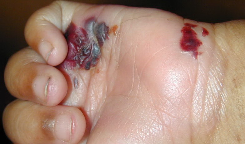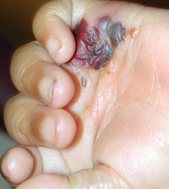 Severe recessively inherited epidermolysis bullosa, as described by Hallopeau-Siemens, usually shows generalized blistering at birth and subsequent extensive dystrophic scarring that is most prominent on the acral surfaces. This can produce pseudosyndactyly (mitten-hand deformity) of the hands and feet. Flexion contractures of the extremities are increasingly common with age. Nails and teeth also are affected. Involvement of internal mucosa can result in esophageal strictures and webs, urethral and anal stenosis, phimosis, and corneal scarring. Malabsorption commonly results in a mixed anemia resulting from a lack of iron absorption, and overall malnutrition may cause failure to thrive (see Diet). Patients with severe recessively inherited epidermolysis bullosa who survive to childhood are at significant risk of developing aggressive SCC in areas of chronic erosions