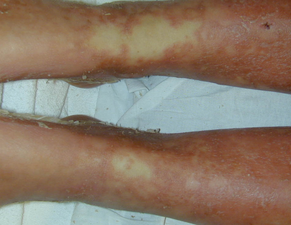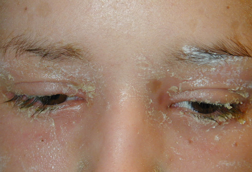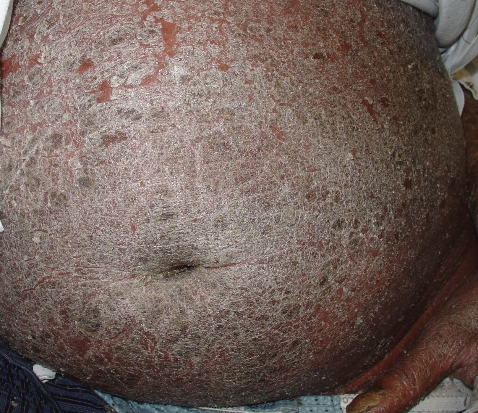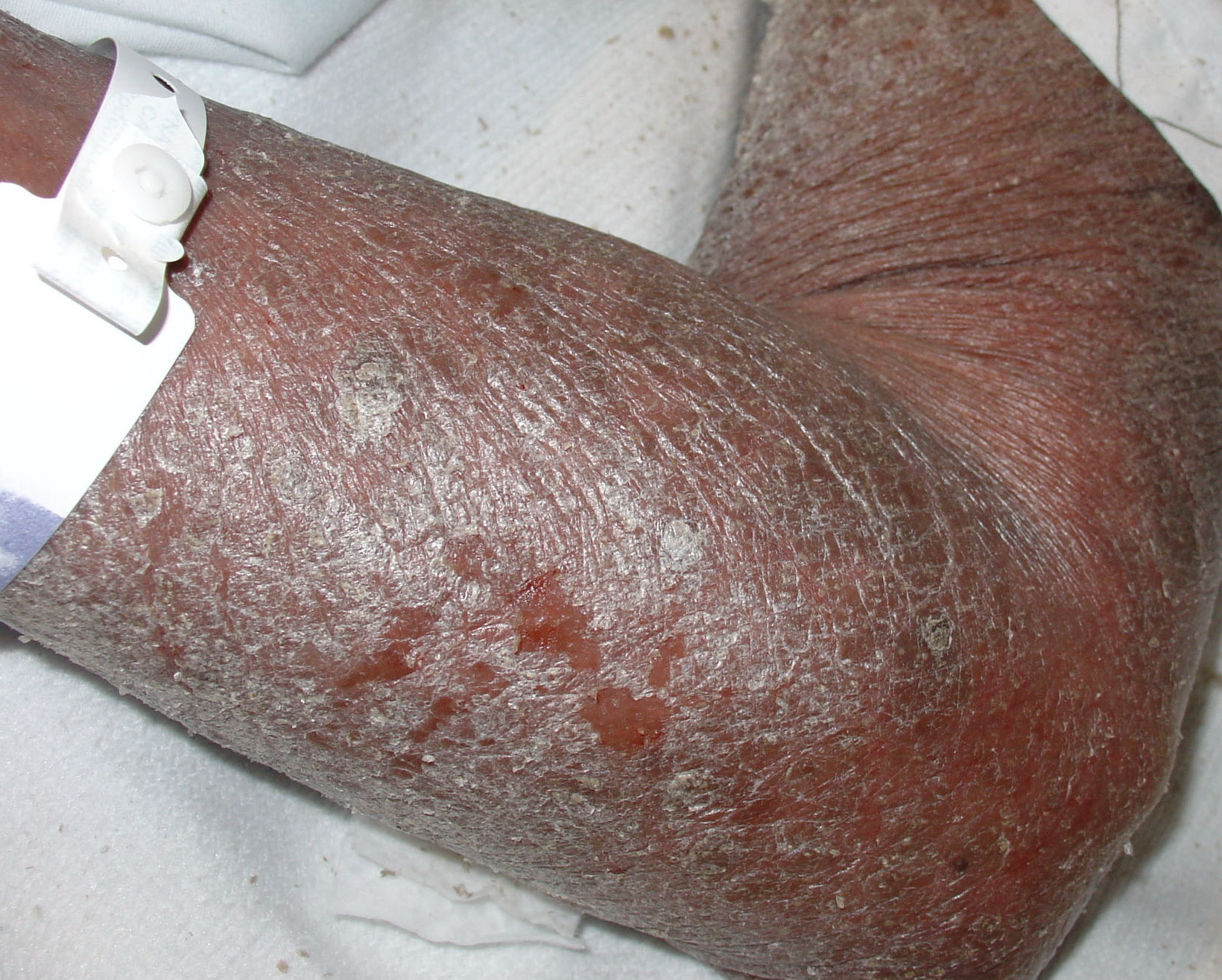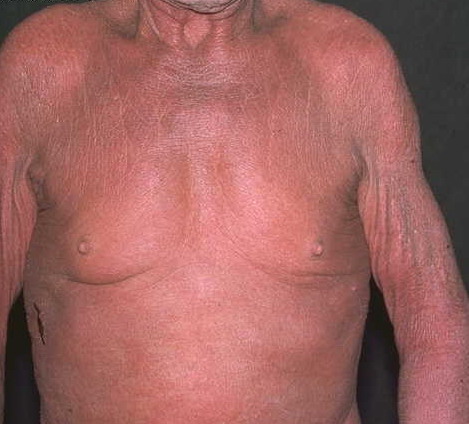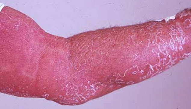Exfoliative dermatitis (ED) is a definitive term that refers to a scaling erythematous dermatitis involving 90% or more of the cutaneous surface. Exfoliative dermatitis is characterized by erythema and scaling involving the skin's surface and often obscures the primary lesions that are important clues to understanding the evolution of the disease. Clinicians are challenged to find the cause of exfoliative dermatitis by eliciting the history of illness prior to erythema and scaling, by probing with biopsies, and by performing blood studies.