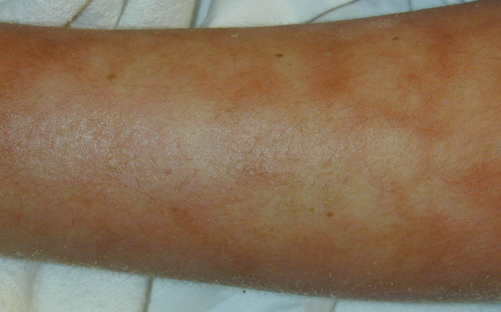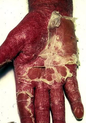 The term red man syndrome is reserved for idiopathic exfoliative dermatitis in which no primary cause can be found, despite serial examinations and tests. Idiopathic exfoliative dermatitis is characterized by marked palmoplantar keratoderma, dermatopathic lymphadenopathy, and a raised level of serum immunoglobulin E (IgE) and is more likely to persist than other types.