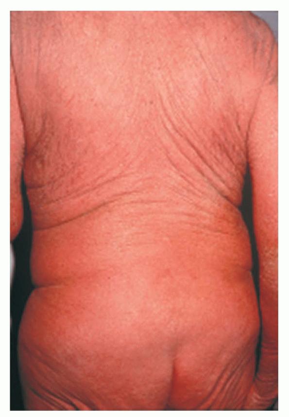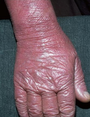 A marked loss of exfoliated scales occurs that may reach 20-30 g/d. This contributes to the hypoalbuminemia commonly observed in exfoliative dermatitis. Hypoalbuminemia results, in part, from decreased synthesis or increased metabolism of albumin. Edema is a frequent finding, probably resulting from fluid shift into the extracellular spaces. Immune responses may be altered, as evidenced by increased gamma-globulins, increased serum IgE in some cases, and CD4+ T-cell lymphocytopenia in the absence of HIV infection.