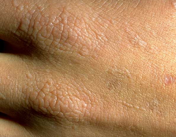 The acute phototoxic reaction typically includes edema, erythema, and petechiae. Blisters, crusted erosions, and scarring may occur but are less florid and less frequent than in other porphyrias. Chronic changes include shallow, elongated depressions in facial skin, especially over the nose; perioral furrowing; and prematurely aged, thickened, or coarsely textured skin of the dorsal hands, often most prominent over the knuckles. In more severe cases, sclerodermalike waxy induration or a cobblestone texture of the face and hands develops. Mechanical fragility, when present, is less severe than in other porphyrias; hypertrichosis is infrequent.