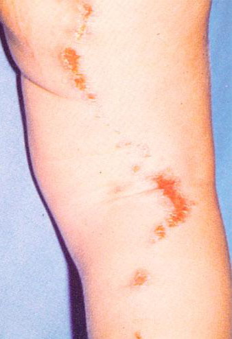 Lichen striatus, linear Darier disease, linear porokeratosis, linear lichen planus, linear psoriasis, and the verrucous stage of incontinentia pigmenti may all have similar clinical presentations as the linear verrucous epidermal nevus. Lichen striatus may mimic ILVEN clinically, but is self-limited and pruritic as compared with epidermal nevi. Histology may be useful in differentiating these entities. Linear Darier disease and linear porokeratosis can be differentiated pathologically with linear Darier disease having the distinct pathologic findings of acantholytic dyskeratosis, and linear porokeratosis having coronoid lamellae. Although some consider linear lichen planus and linear psoriasis to be variants of the ILVEN, the genetics and the immunology has yet to be fully characterized. Incontinentia pigmenti can be distinguished clinically based on the transient nature of this phase and the preceding verrucous phase. Histologically, this entity can be distinguished by its dyskeratosis, pigment incontinence, eosinophilic exocytosis, and basal layer vacuolization.