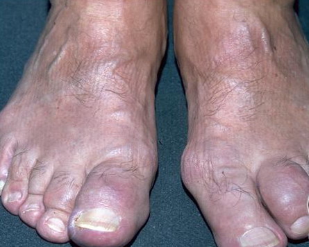 Gout is a clinical syndrome caused by a group of heterogeneous diseases characterized by deposition of monosodium urate crystals in synovial fluid and joints with or without hyperuricemia, renal disease, and nephrolithiasis. Classically, the presentation is that of an acute lower extremity peripheral joint inflammatory synovitis. The most commonly affected sites are the first metatarsophalangeal joint and the ankle.