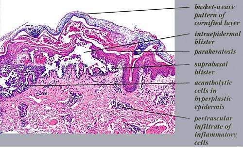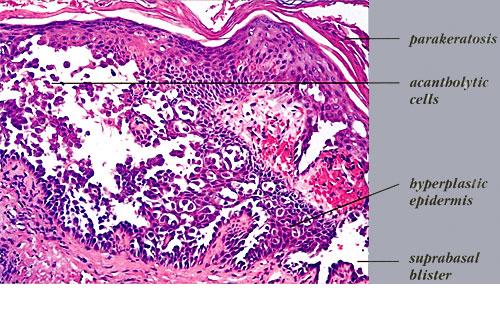 Histologically, familial benign pemphigus shares certain features with both Darier's disease and pemphigus vulgaris. In all three diseases, one finds predominantly suprabasal separation of the epidermis caused by acantholysis and resulting in lacunae or bullae and villi formation.
