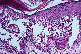 Pemphigus vulgaris often resembles familial benign pemphigus to a striking degree, and in some specimens, histologic differentiation of these two diseases may be impossible. As a rule, however, there is less extensive acantholysis in pemphigus vulgaris, limited largely to the suprabasal region, so the detached epidermis appears normal and lacks the appearance of a dilapidated brick wall, and more severe degeneration of the acantholytic cells within and near the bulla cavity. The presence of eosinophils in the bulla points toward a diagnosis of pemphigus vulgaris, but their absence does not rule it out. In case of doubt, immunofluorescence will decide the issue.