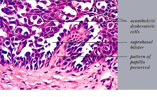 Although, as in Darier's disease, early lesions may show small suprabasal separations, so-called lacunae, fully developed lesions show large separations, that is, vesicles and even bullae, in a predominantly suprabasal position . Villi, which are elongated papillae lined by a single layer of basal cells, protrude upward into the bulla, and in some cases,