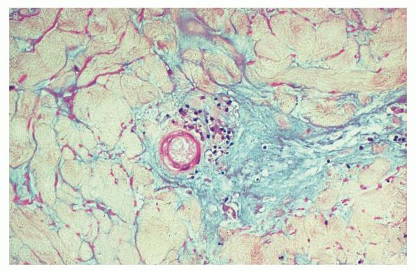Degos had initially described a cutaneointestinal syndrome in which distinct skin findings ("drops of porcelain") were associated with recurrent attacks of abdominal pain that often ended in death from intestinal perforations . The skin lesions of this syndrome arise in crops of asymptomatic, slightly raised, yellowish red papules that gradually develop an atrophic porcelain-white center. These papules tend to affect the trunk and proximal extremities. Degos chose the name malignant atrophic papulosis (MAP) for these lesions to emphasize the serious clinical course of the cutaneointestinal disease he was describing. At that time, the cutaneous lesions were then thought to be specific and pathognomonic for this unique disease entity (Degos' disease). However, skin-limited forms of Degos' disease have been described , and currently such skin lesions are considered to be a clinicopathologic reaction pattern that can be associated with a number of conditions . Lesions similar if not identical to MAP have been noted in connective tissue diseases such as lupus erythematosus, dermatomyositis, and progressive systemic sclerosis, in atrophie blanche, and in Creutzfeldt-Jakob disease