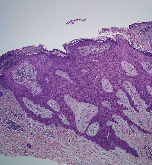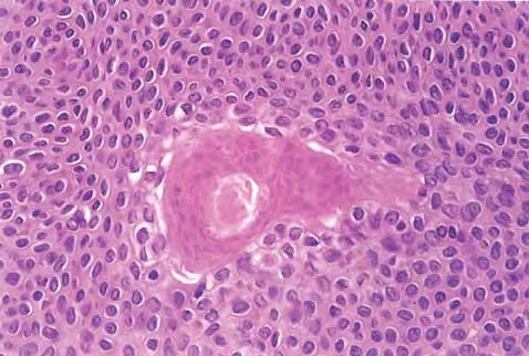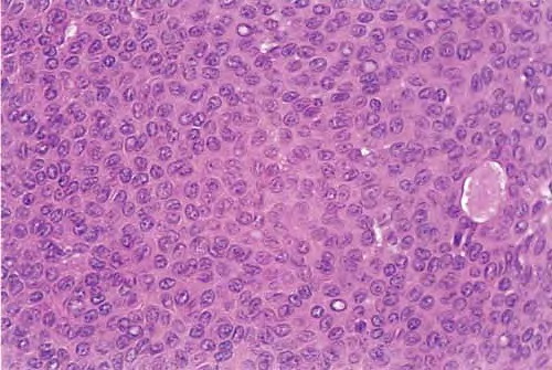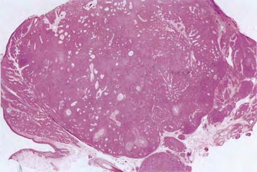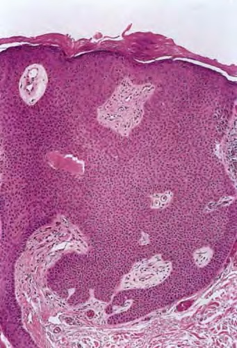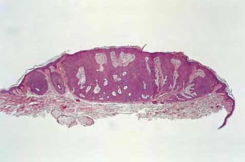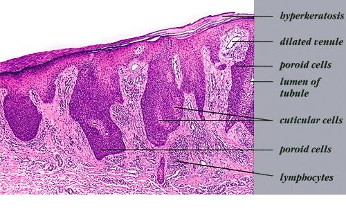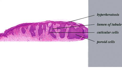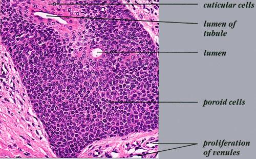 Hidroacanthoma simplex shows sharply demarcated aggregations of cuboid to ovoid cells confined to the epidermis. Eccrine poroma reveals aggregations of uniform basaloid cells that radiate from the basal layer of the epidermis into the dermis . Dermal duct tumor consists of several sharply circumscribed, mainly dermal nodules composed of poroid and cuticular cells. Ductal structures are frequently observed. Poroid hidradenoma is characterized by intradermal, solid, and cystic aggregations of poroid cells.