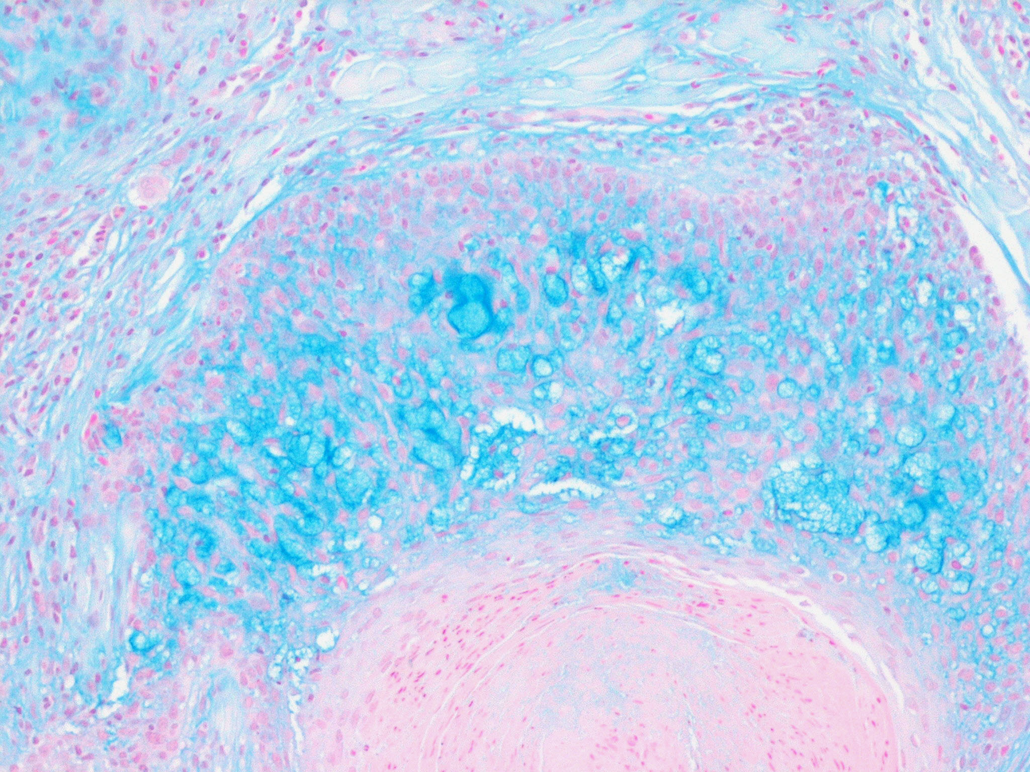 The mucin present in the six types of mucinosis stains a light blue in sections stained with H&E. It also stains with colloidal iron. It is Alcian blue-positive at pH 2.5 but negative at pH 0.5 and shows metachromasia with toluidine blue at pH 7.0 and 4.0 but no metachromasia below pH 2.0 . It is PAS negative (indicating the absence of neutral mucopolysaccharides) and aldehyde fuchsin negative (indicating the absence of sulfated acid mucopolysaccharides). The mucin is completely removed on incubation of histologic sections with testicular hyaluronidase for 1 hour at 37"C .