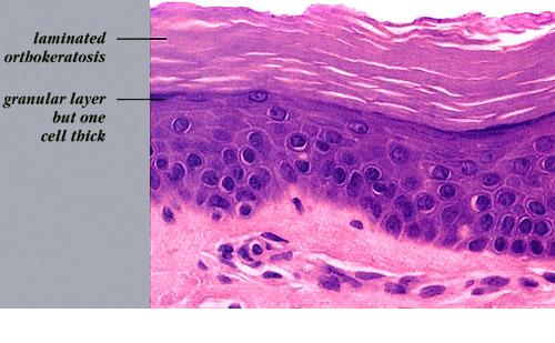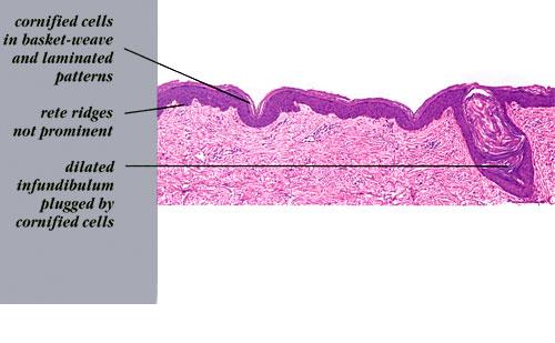 The characteristic finding is the association of a moderate degree of hyperkeratosis with a thin or absent granular layer . The hyperkeratosis often extends into the hair follicles, resulting in large keratotic follicular plugs. The dermis is normal.