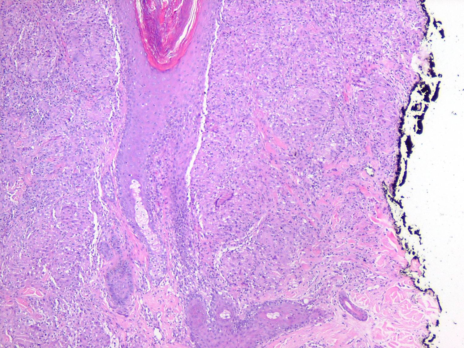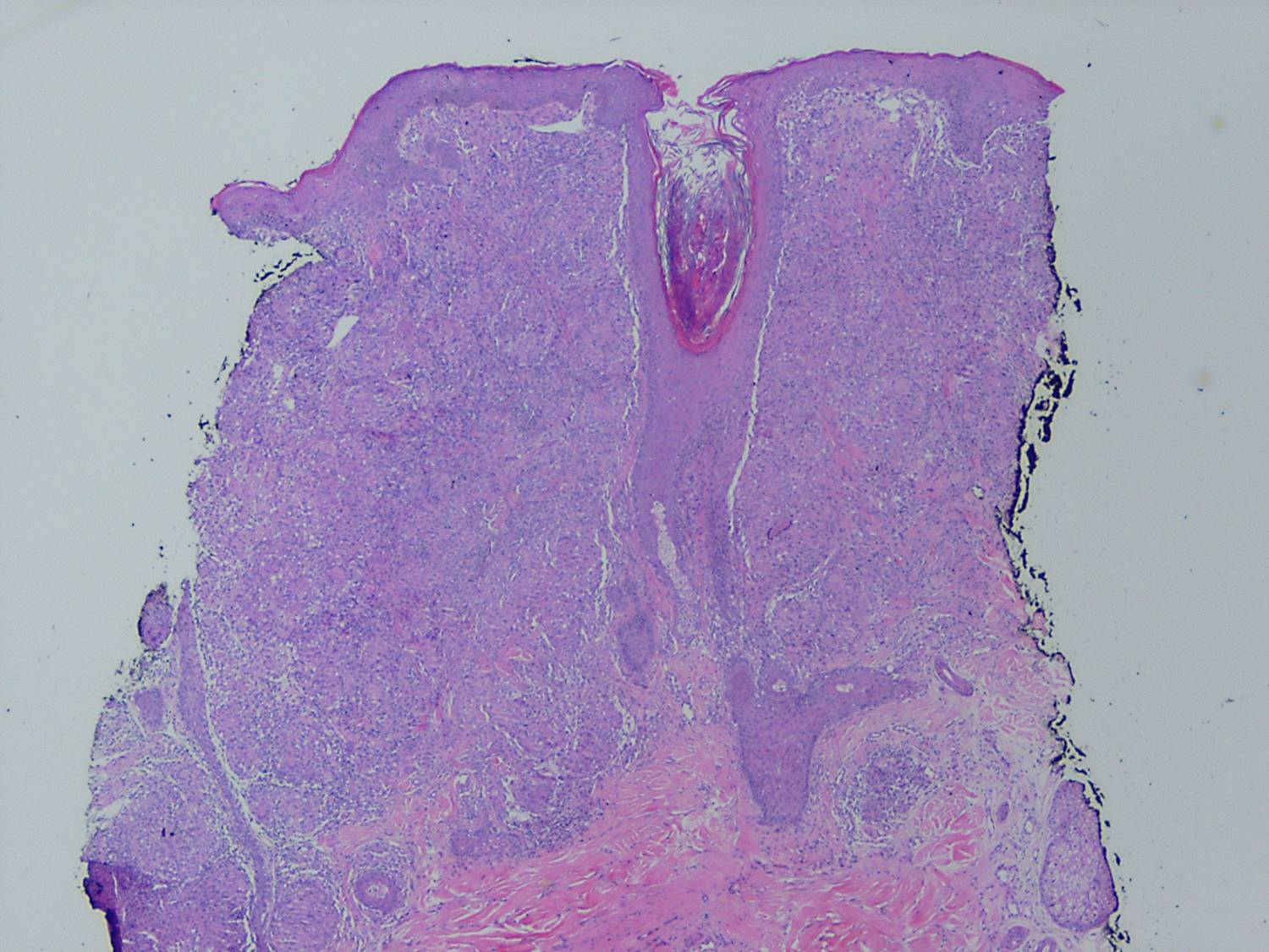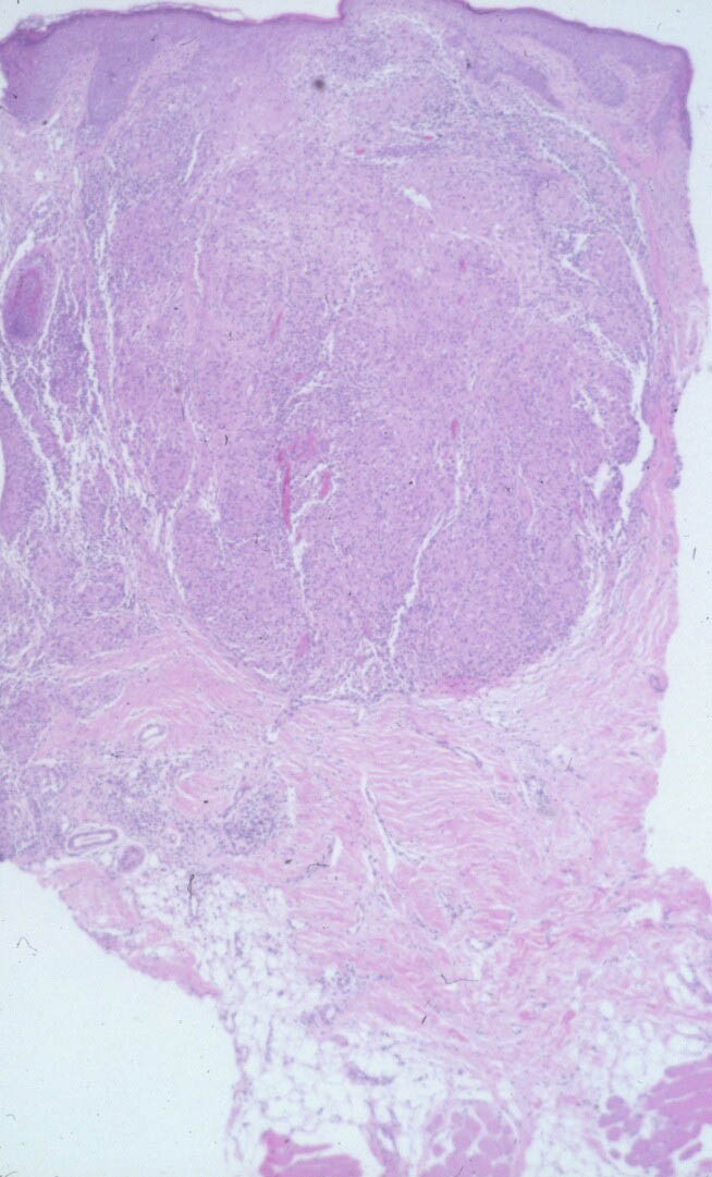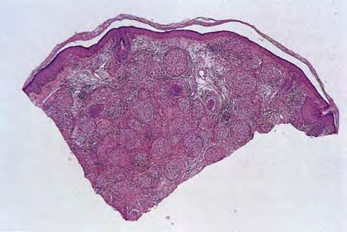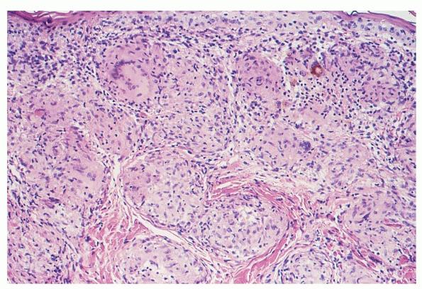 The papules, plaques, and lupus pernio-type lesions show variously sized aggregates of epithelioid cells scattered irregularly through the dermis with occasional extension into the subcutis (. In the erythrodermic form, the infiltrate shows small granulomas in the upper dermis intermingled with numerous lymphocytes