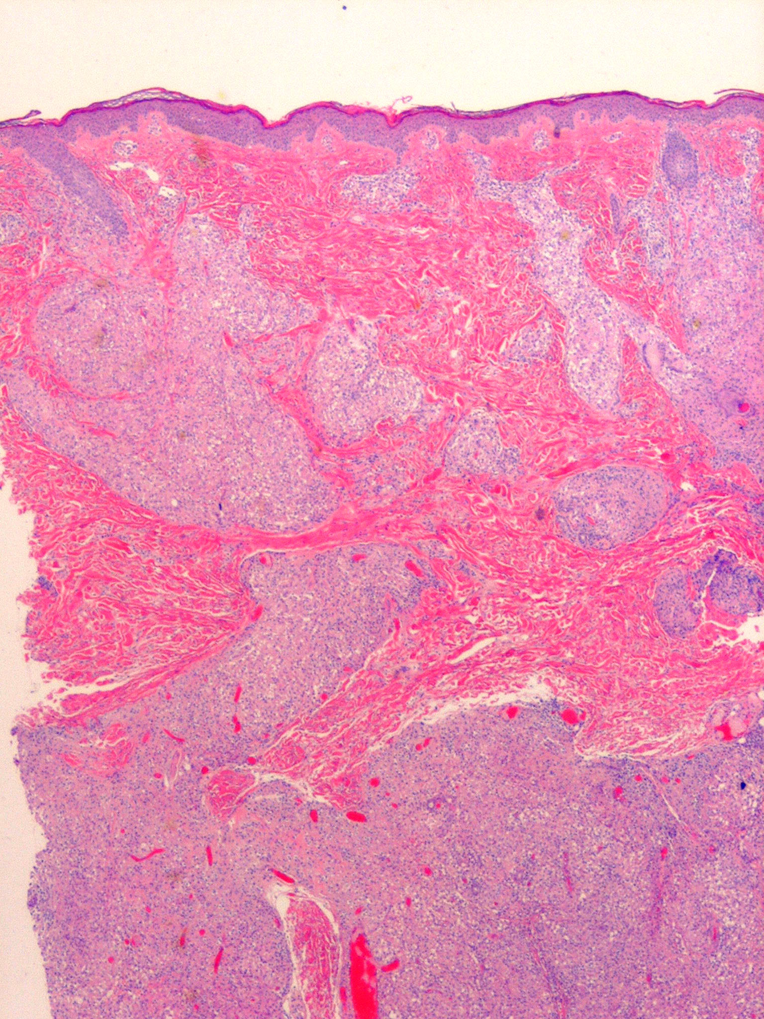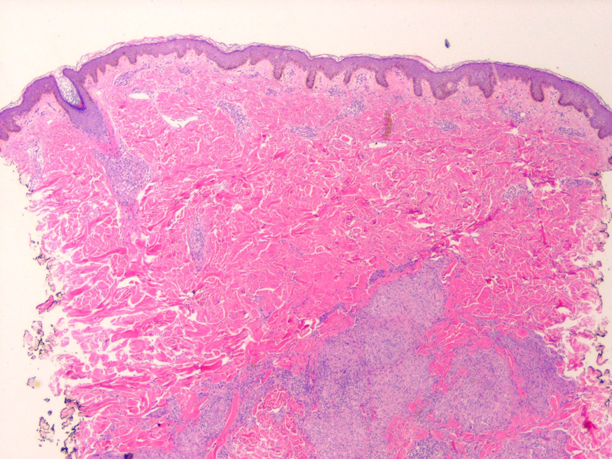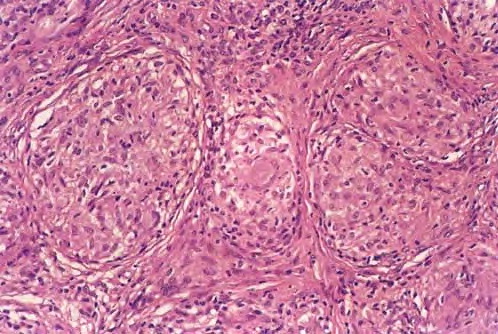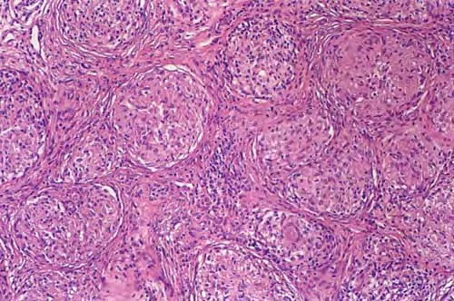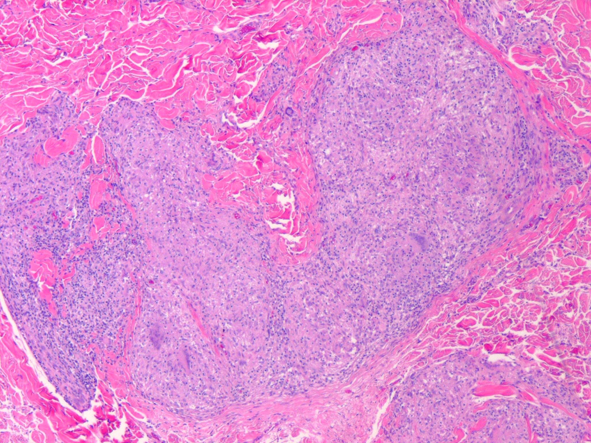 The papules, plaques, and lupus pernio-type lesions show variously sized aggregates of epithelioid cells scattered irregularly through the dermis with occasional extension into the subcutis (. In the erythrodermic form, the infiltrate shows small granulomas in the upper dermis intermingled with numerous lymphocytes
