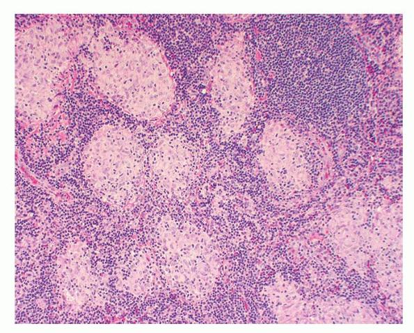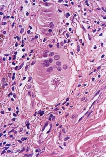 Tuberculoid leprosy, which may show granulomas in association with only a sparse lymphocytic infiltrate, can also be difficult to distinguish from sarcoidosis. Only 7% of cases of tuberculoid leprosy show acid-fast bacilli, and then only a few, so that they may easily be overlooked . The most likely place to find bacilli is within degenerated dermal nerves (the granulomas of tuberculoid leprosy form around dermal nerves that are undergoing necrosis). The granulomas of tuberculoid leprosy show small areas of central necrosis more often than those of sarcoidosis. In addition, the granulomas of tuberculoid leprosy, in contrast with those of sarcoidosis, follow nerves and therefore often appear elongated . Clinical correlation may be required to distinguish between these two diseases. For example, in the United States, leprosy virtually can be excluded if a patient has not been in an endemic area (either in a foreign country or where it is carried in armadillos domestically, e.g., Texas and Louisiana) or has not had prolonged close contact with another individual with the disease