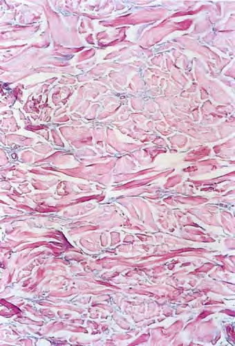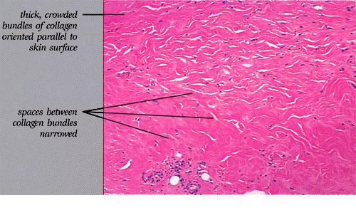longer present and scleredema. As a rule, however, in scleroderma, the collagen in the reticular dermis and subcutaneous tissue appears homogenized and hyalinized and stains only lightly with eosin and with the Masson trichrome stain, but in scleredema, the collagen bundles are thickened without being hyalinized and stain normally with eosin and the trichrome stain . A marked increase in type 1 collagen gene expression occurs in scleroderma, leading to increased collagen synthesis