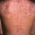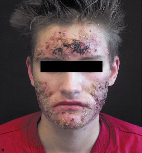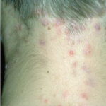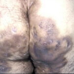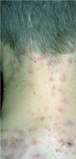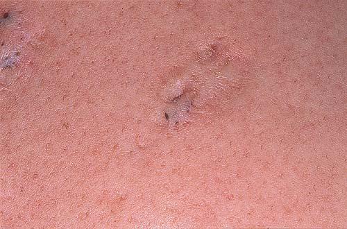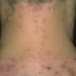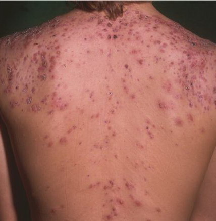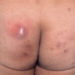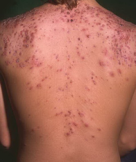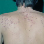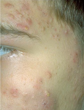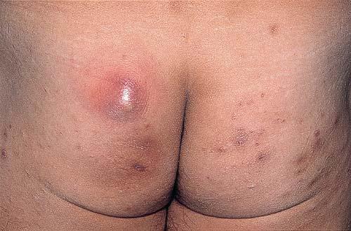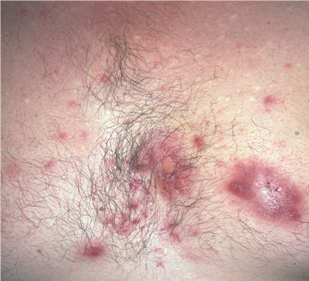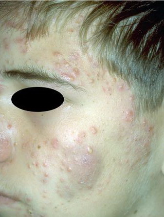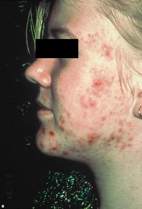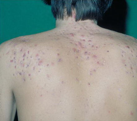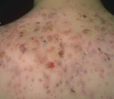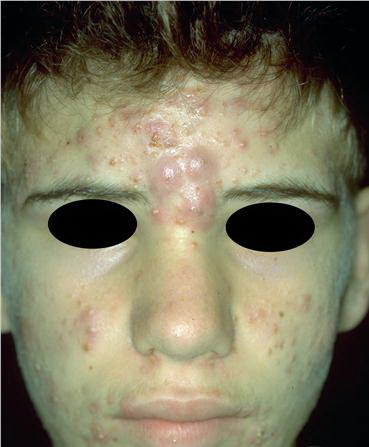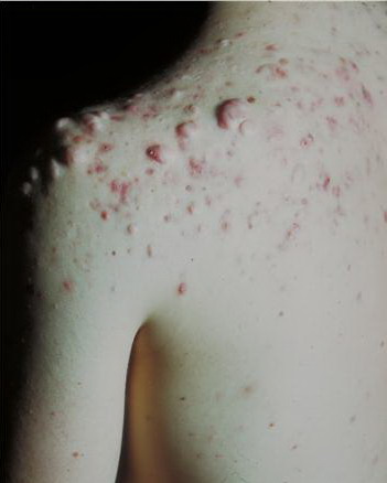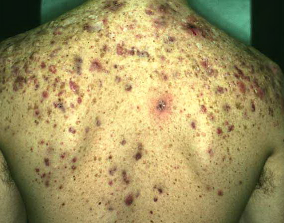 Acne conglobata, a severe form of nodular acne is most common in teenage males but can occur in either sex and into adulthood. Acne conglobata (conglobate means shaped in a rounded mass or ball) is a mixture of comedones, papules, pustules, nodules, abscesses, and scars. It can be on the back, buttocks, chest, and, to a lesser extent, on the abdomen, shoulders, neck, face, upper arms, and thighs . The comedones often have multiple openings. The inflammatory lesions are large, tender, and dusky-colored. The draining lesions discharge a foul-smelling serous, purulent, or mucoid material. Subcutaneous dissection with the formation of multichanneled sinus tracts is common. Healing results in an admixture of depressed and keloidal scars. The management of these patients is very difficult and the effect of treatment is often temporary. Several medications have been used, including intensive high-dose therapy with antibiotics, intralesional glucocorticoids, systemic glucocorticoids, surgical débridement, surgical incision, and surgical excision. The use of isotretinoin has produced dramatic results in some of these patients. In severe cases, dosages as high as 2 mg/kg/day for a 20-week course may be necessary. However, because severe flares may occur when isotretinoin is started, the initial dose should be 0.5 mg/kg/day or less, and systemic glucocorticoids are often required either before initiating isotretinoin therapy or as concomitant therapy.