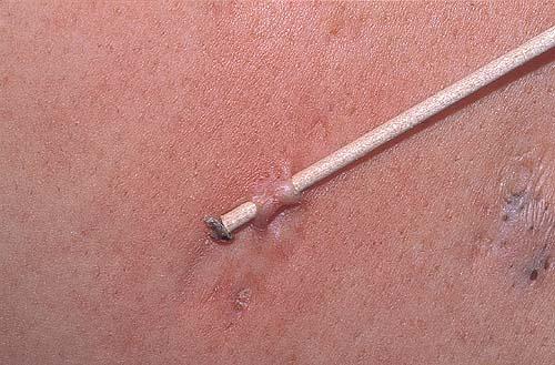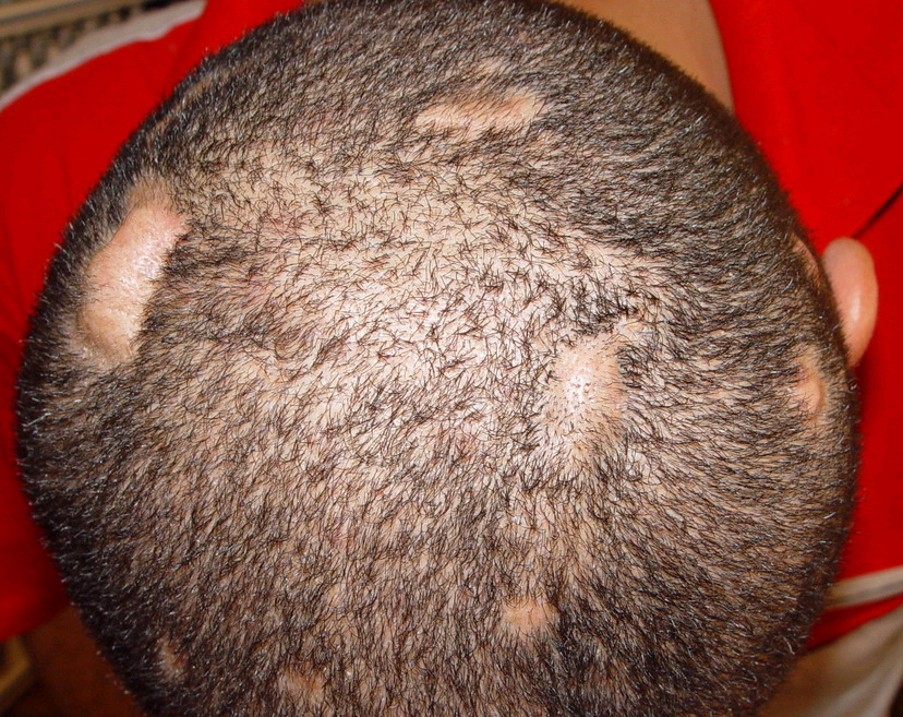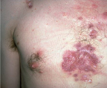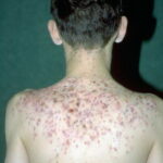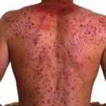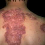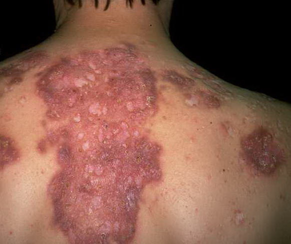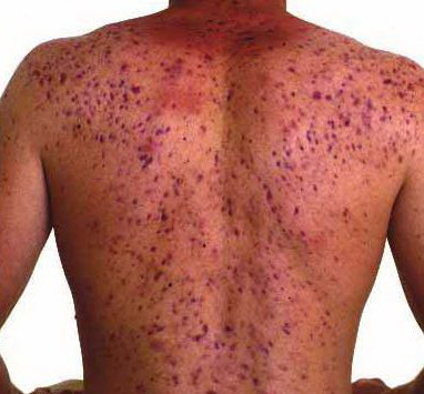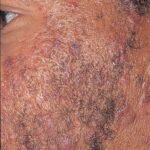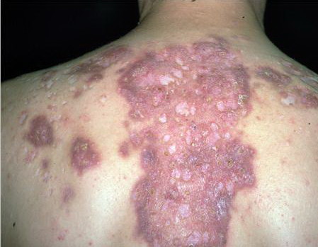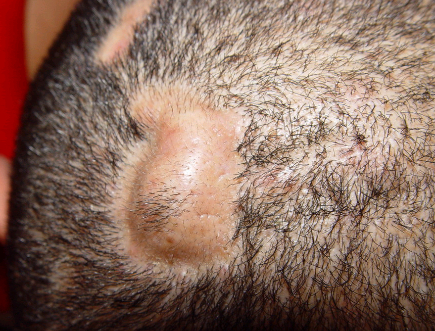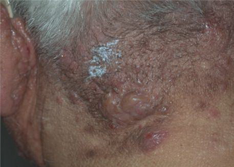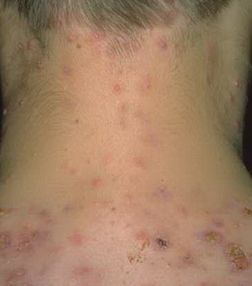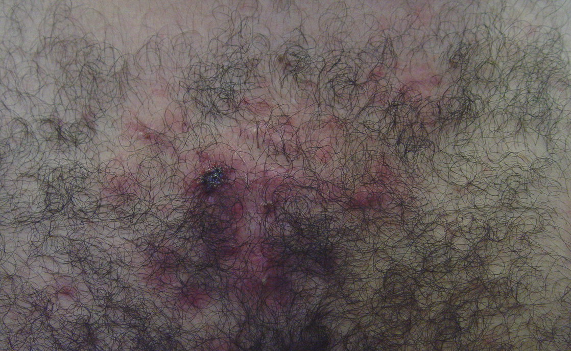 Acne conglobata, a severe form of nodular acne is most common in teenage males but can occur in either sex and into adulthood. Acne conglobata (conglobate means shaped in a rounded mass or ball) is a mixture of comedones, papules, pustules, nodules, abscesses, and scars. It can be on the back, buttocks, chest, and, to a lesser extent, on the abdomen, shoulders, neck, face, upper arms, and thighs . The comedones often have multiple openings. The inflammatory lesions are large, tender, and dusky-colored. The draining lesions discharge a foul-smelling serous, purulent, or mucoid material. Subcutaneous dissection with the formation of multichanneled sinus tracts is common. Healing results in an admixture of depressed and keloidal scars. The management of these patients is very difficult and the effect of treatment is often temporary. Several medications have been used, including intensive high-dose therapy with antibiotics, intralesional glucocorticoids, systemic glucocorticoids, surgical débridement, surgical incision, and surgical excision. The use of isotretinoin has produced dramatic results in some of these patients. In severe cases, dosages as high as 2 mg/kg/day for a 20-week course may be necessary. However, because severe flares may occur when isotretinoin is started, the initial dose should be 0.5 mg/kg/day or less, and systemic glucocorticoids are often required either before initiating isotretinoin therapy or as concomitant therapy.