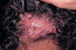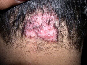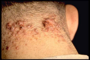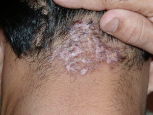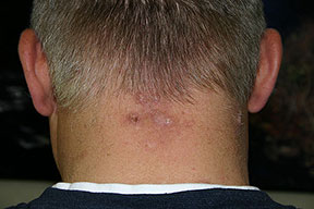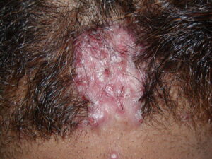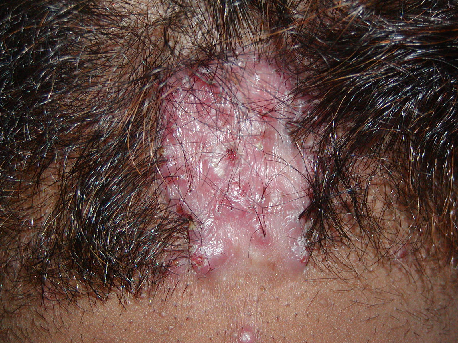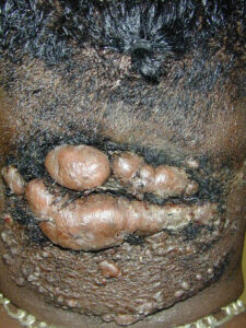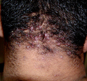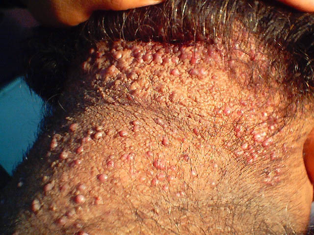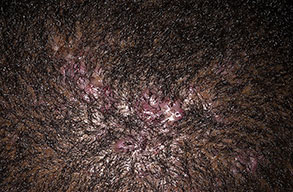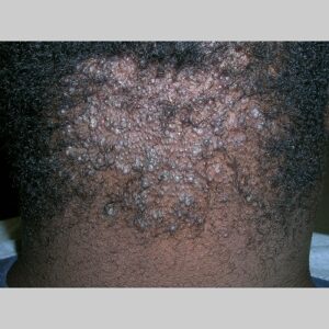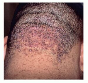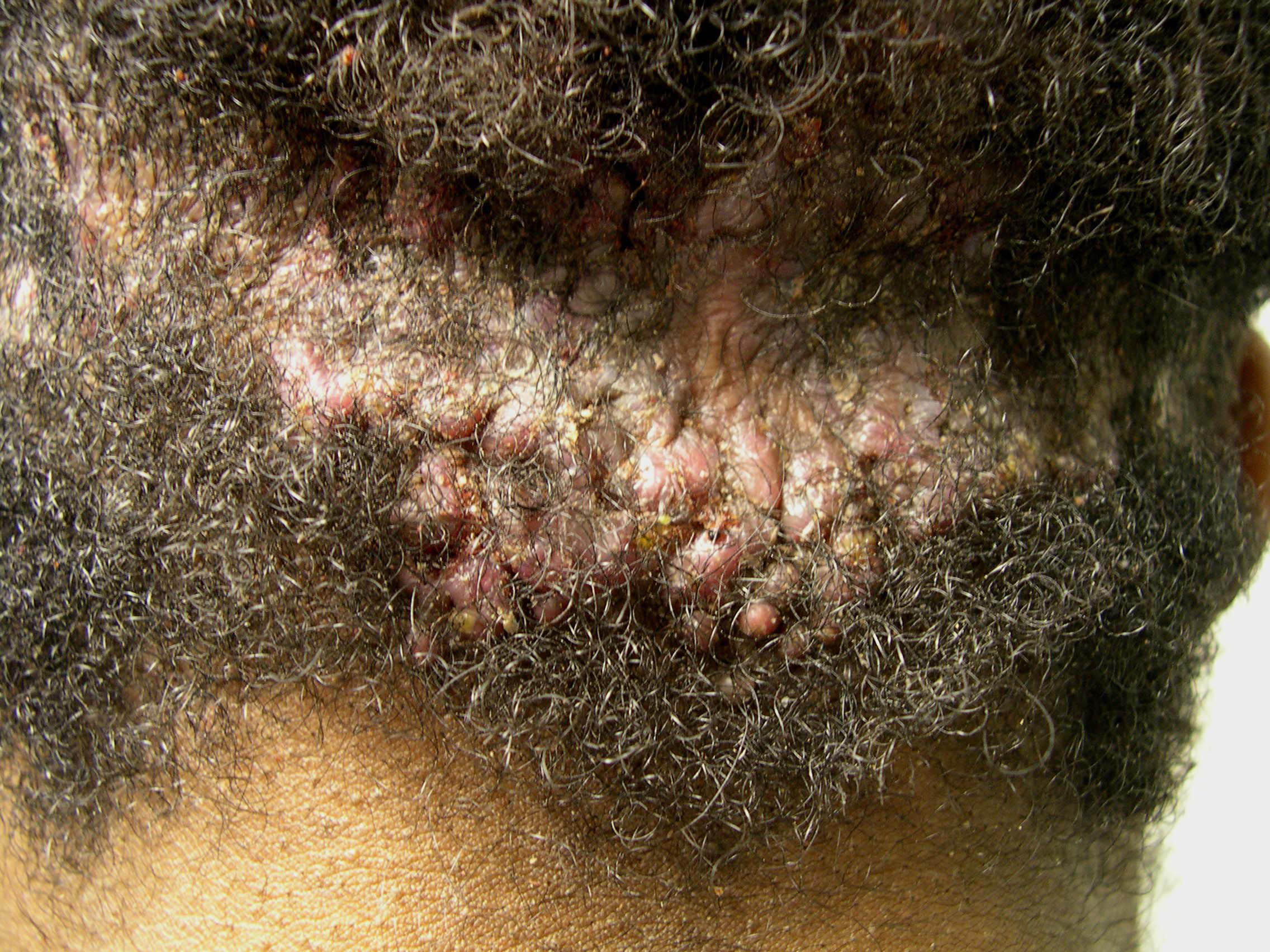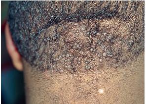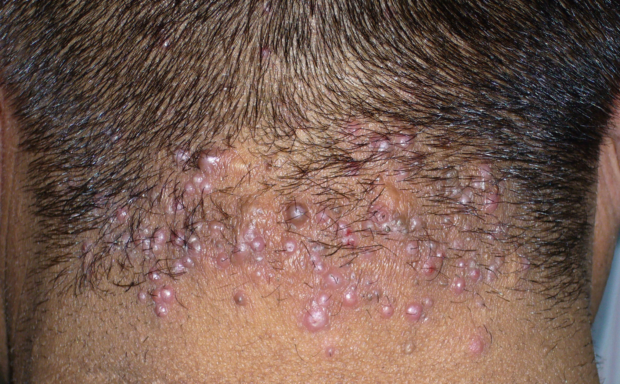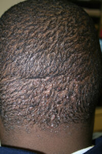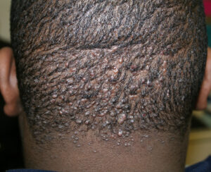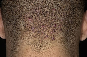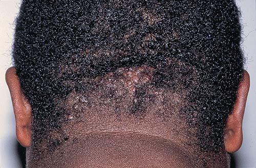 Acne keloidalis nuchae (AKN) is a scarring form of chronic folliculitis that manifests as follicular-based papules and pustules, which eventuates in keloidlike lesions. The lesions are most pronounced on the occipital scalp and the posterior part of the neck, and they occur almost exclusively in young males of African descent.1 The term acne keloidalis nuchae is somewhat of a misnomer because the lesions do not occur as a result of acne vulgaris and are histologically not keloidal.2
