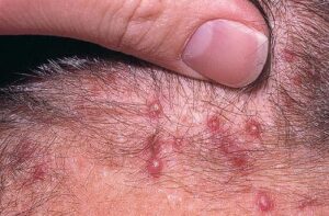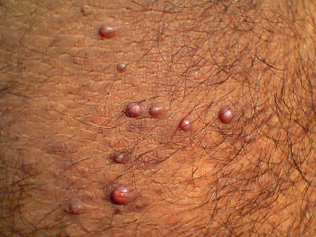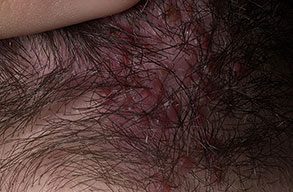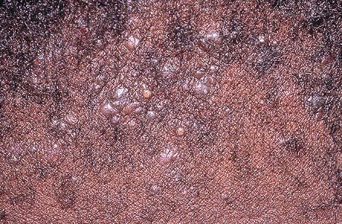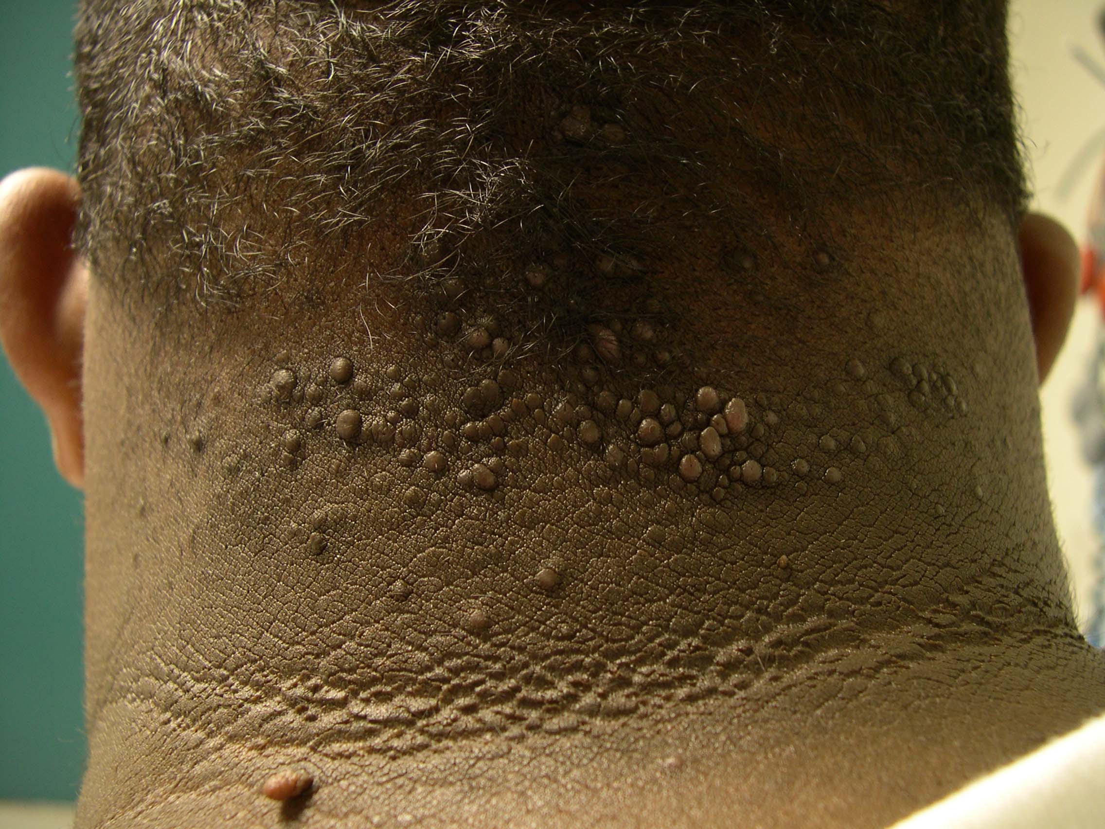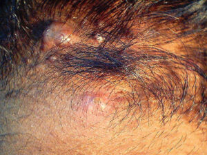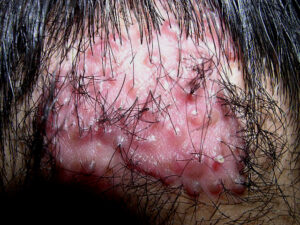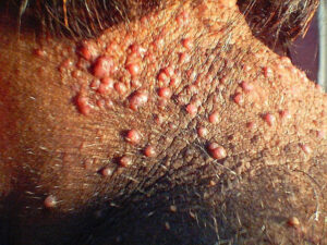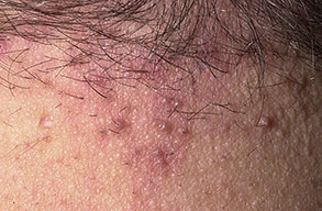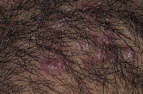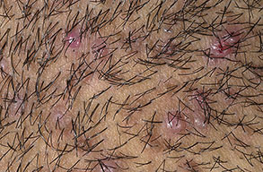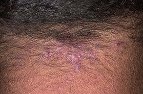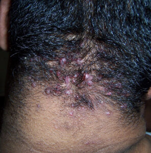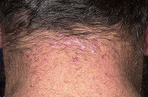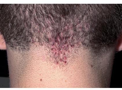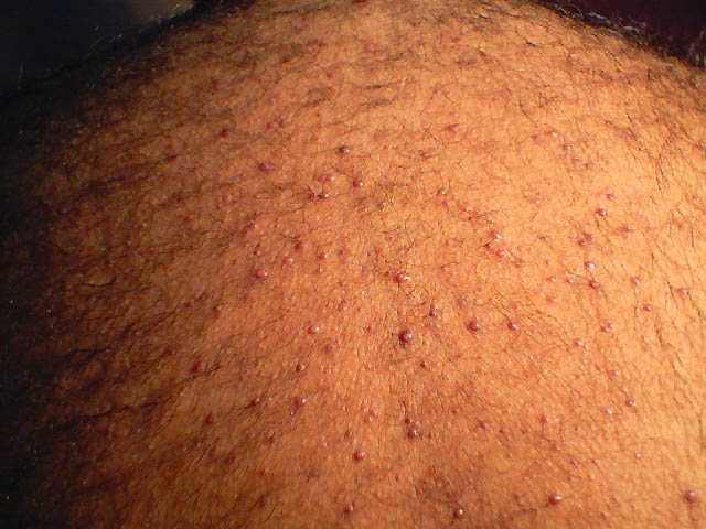 Early lesions manifest as firm, dome-shaped, follicular-based papules that are 2-4 mm in diameter. The papules are predominately located on the occipital region and nape of the neck. Pustules may be present, but often only excoriated papules can be identified because the lesions are often pruritic or they become traumatized when the hair is groomed.
