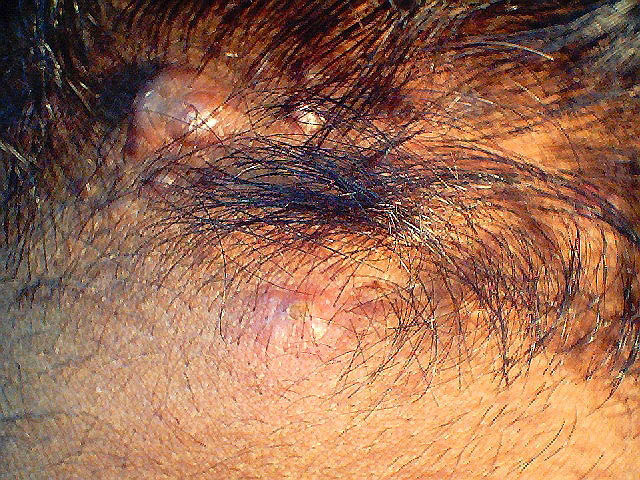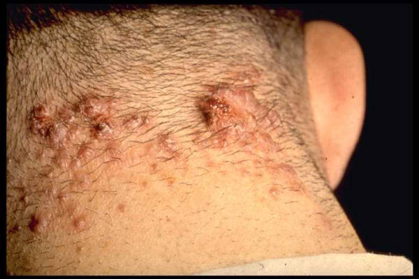 Early papular lesions are usually asymptomatic, but pustular lesions are often pruritic and occasionally painful. Large lesions can be painful. Abscesses and sinuses may be present and may emit purulent, malodorous discharge. Hats, shirts, jackets, and sweaters can irritate the involved area.