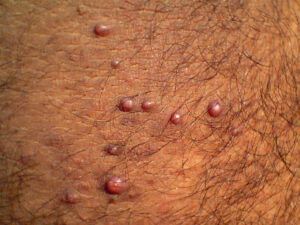 As the disease progresses, more papules and pustules appear and, over time, can coalesce to form larger plaques.