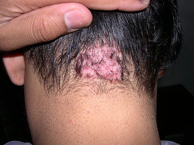 Sperling et al classify acne keloidalis nuchae as a primary form of inflammatory scarring alopecia and suggest that overgrowth of microorganisms does not play an essential role in the pathogenesis of acne keloidalis nuchae. They also found no association between pseudofolliculitis barbae and acne keloidalis nuchae.8
