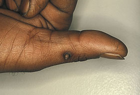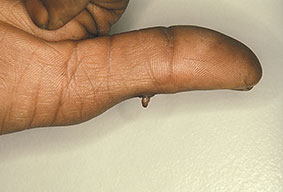 Clinically, acquired digital fibrokeratomas manifest as solitary, skin-colored, dome-shaped papules or tall fingerlike protrusions with a hyperkeratotic surface. Most acquired digital fibrokeratoma lesions are small and do not exceed 1.5 cm in height or diameter, but giant lesions measuring in excess of 3 cm have been documented.8