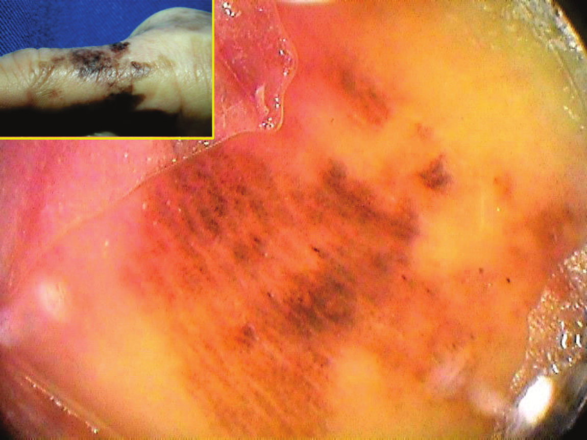 Clinically, in situ or microinvasive acral-lentiginous melanoma shows uneven pigmentation with an irregular, often indefinite border. The soles of the feet are most commonly involved. If the tumor is situated in the nail matrix, the nail and nail bed may show a longitudinal pigmented band, and the pigment may extend onto the nail fold (Hutchinson’s sign). Tumorigenic vertical growth may be heralded by the