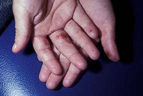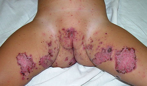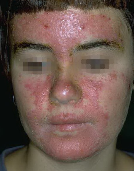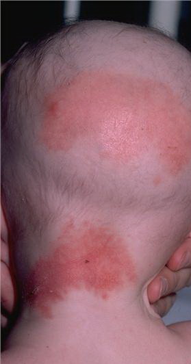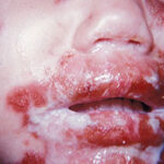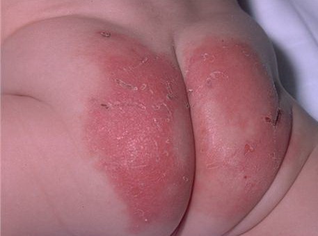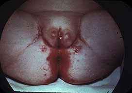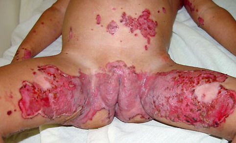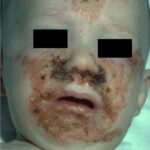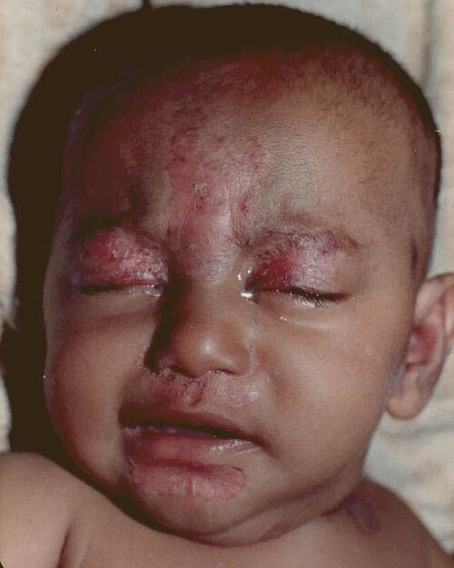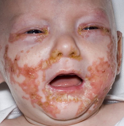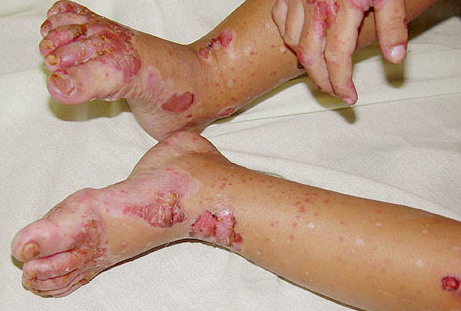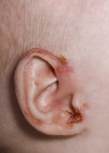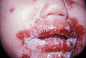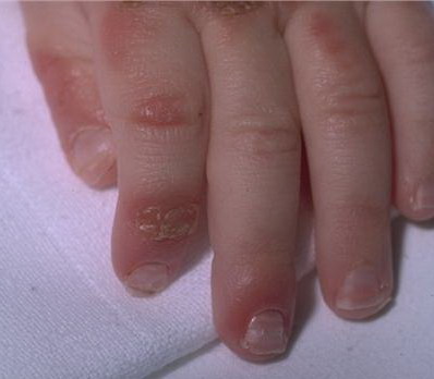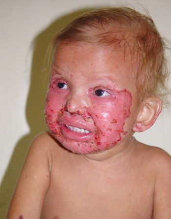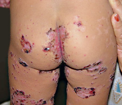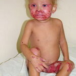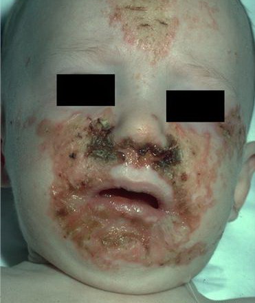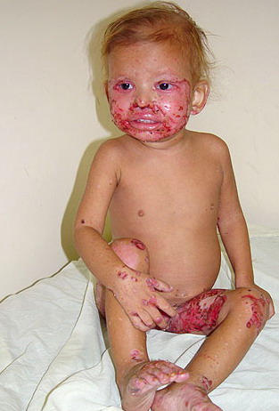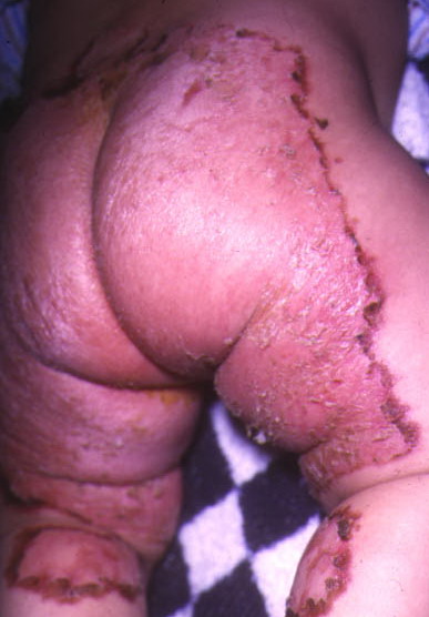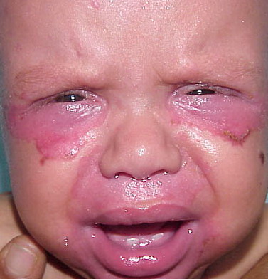 AE presents soon after weaning in affected infants or during the fourth to tenth week of life in infants who are not breast-fed. The classic features of AE include alopecia, diarrhea, lethargy, and an acute eczematous and erosive dermatitis favoring acral areas—perioral, periocular, anogenital, hands, and feet . The cutaneous findings are highly characteristic and often present initially as a non-specific, acrally distributed, symmetric, eczematous dermatitis. Over time, bullae and erosions with a characteristic peripheral crusted border develop. Patients also appear to be predisposed to systemic infections as a result of impaired cell-mediated immunity, and superinfection with Candida albicans and bacteria, usually Staphylococcus aureus, is common. Delayed wound healing, acute paronychia, conjunctivitis, blepharitis, and photophobia may also be observed. Diarrhea may be prominent but is not seen in all cases. If untreated, the disease is fatal. Acute zinc deficiency secondary to impaired absorption of zinc, inadequate intake, or excessive renal or intestinal losses may result in a clinical picture that resembles AE and occurs also in adults .