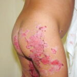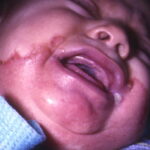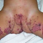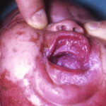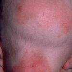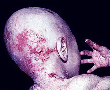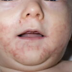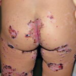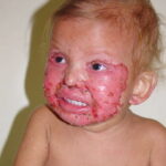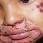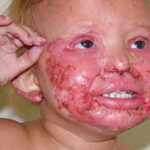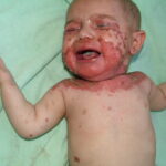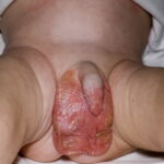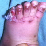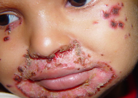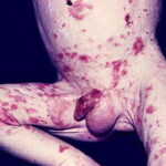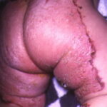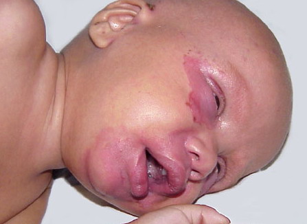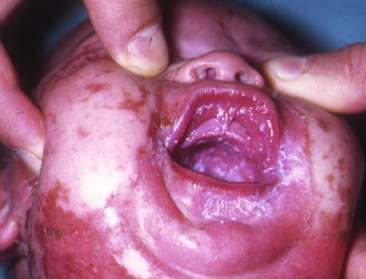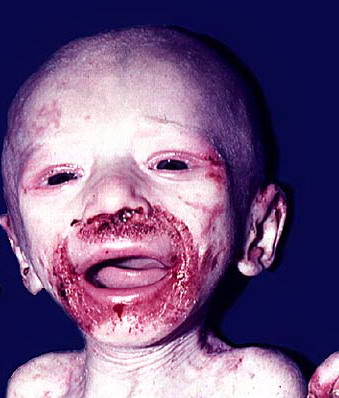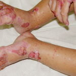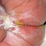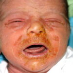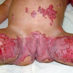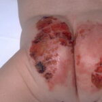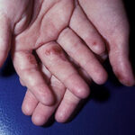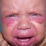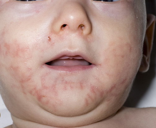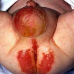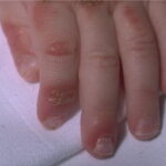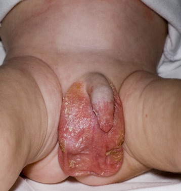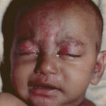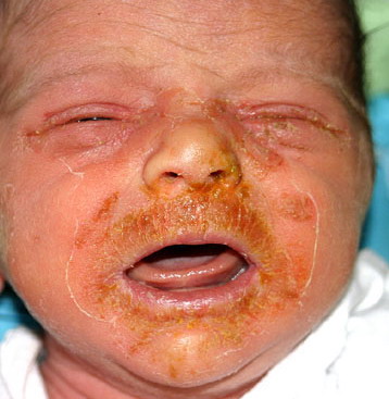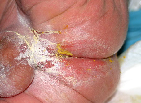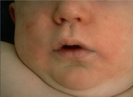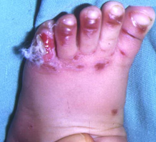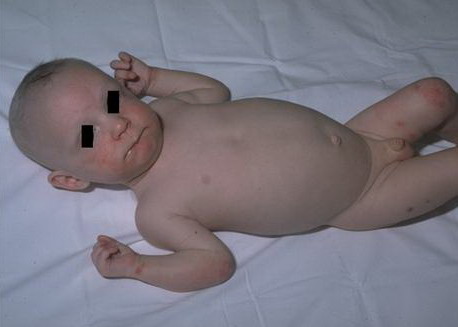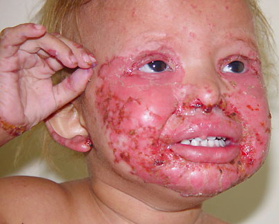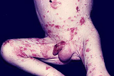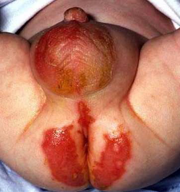 AE presents soon after weaning in affected infants or during the fourth to tenth week of life in infants who are not breast-fed. The classic features of AE include alopecia, diarrhea, lethargy, and an acute eczematous and erosive dermatitis favoring acral areas—perioral, periocular, anogenital, hands, and feet . The cutaneous findings are highly characteristic and often present initially as a non-specific, acrally distributed, symmetric, eczematous dermatitis. Over time, bullae and erosions with a characteristic peripheral crusted border develop. Patients also appear to be predisposed to systemic infections as a result of impaired cell-mediated immunity, and superinfection with Candida albicans and bacteria, usually Staphylococcus aureus, is common. Delayed wound healing, acute paronychia, conjunctivitis, blepharitis, and photophobia may also be observed. Diarrhea may be prominent but is not seen in all cases. If untreated, the disease is fatal. Acute zinc deficiency secondary to impaired absorption of zinc, inadequate intake, or excessive renal or intestinal losses may result in a clinical picture that resembles AE and occurs also in adults .