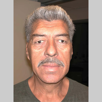 The clinical manifestations of acromegaly include the overgrowth of bone and connective tissue, metabolic effects, and localized tumor mass effects. The onset is insidious, and the average age at the time of diagnosis is 40 to 45 years old, but often the condition has been present for many years before the diagnosis. The metabolic effects include diabetes, hypertension, and hyperlipidemia. There is a gradual coarsening of the features and increased head, hand, and foot size. This acral pattern of overgrowth may be noticed as increasing shoe, ring, glove, or hat size . Macroglossia can be seen. The skin becomes thickened, almost doughy, with deep grooves prominent on the forehead and around the nasolabial folds . On the scalp, cutis verticis gyrata may develop. Heel pads and the pads of the digits become thickened. Nails are thickened and brittle, and some patients develop hirsutism. Hyperhidrosis and malodor are common complaints. Many patients develop