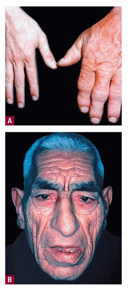 Excessive production of GH is almost always due to a pituitary adenoma. In children, this results in pituitary gigantism, whereas in adults, excessive GH manifests as the clinical syndrome acromegaly. This syndrome is diagnosed in about 3 to 4 people per million every year.171 Very rarely, acromegaly is caused by a GH-producing tumor in the hypothalamus or by an ectopic non-endocrine tumor such as small cell lung cancer or carcinoid tumor.172 GH-producing adenomas are present in 8 percent of patients with Carney complex, an inherited disorder with multiple lentigines and multiple endocrine abnormalities.173