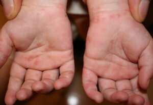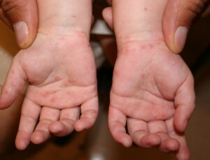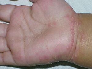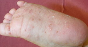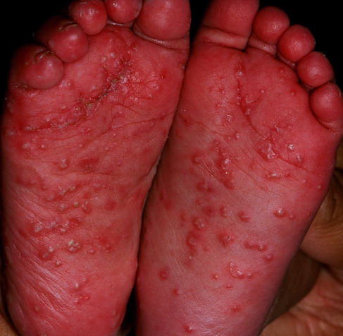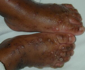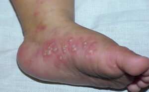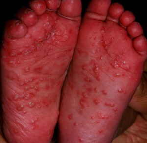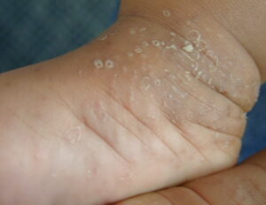 Infantile acropustulosis lesions begin as small macules or papules that then form distinct, noncoalescing vesicles and pustules (see the image below). They heal with macular hyperpigmentation. No other organ systems are involved in infantile acropustulosis,