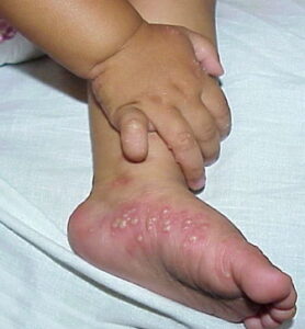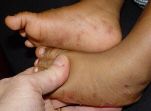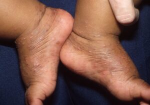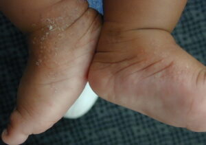 Infantile acropustulosis is a recurrent, self-limited, pruritic, vesicopustular eruption of the palms and the soles occurring in young children during the first 2-3 years of life. Newly described in 1979, infantile acropustulosis is probably much more common than the scarcity of reports would imply.1