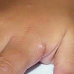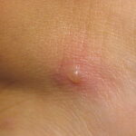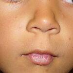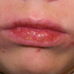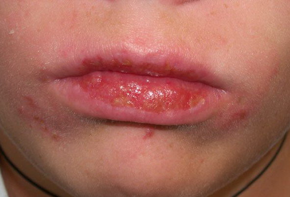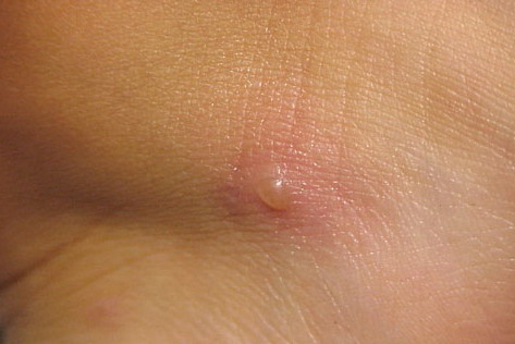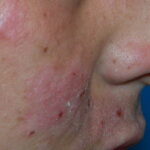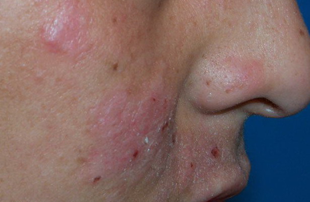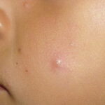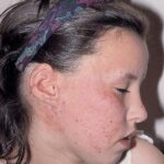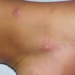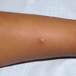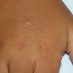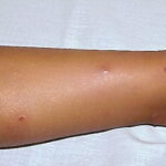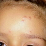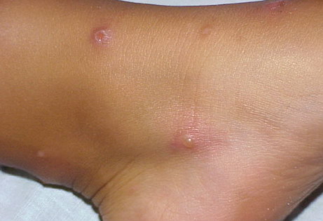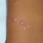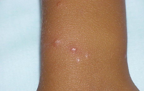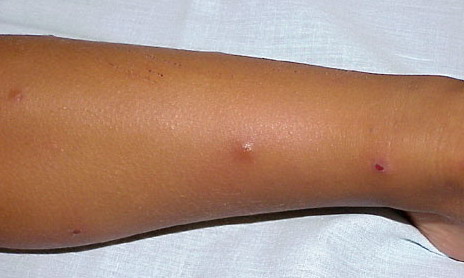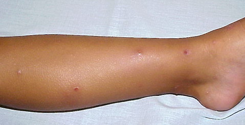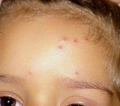 Lesions are typically very pruritic, usually excoriated papules or nodules , sometimes associated with variable eczematization, lichenification, or crusting. All exposed areas are usually affected, particularly consistently uncovered sites, with a gradual fading toward habitually covered skin. The latter areas are also often mildly affected, particularly over the sacral area and buttocks. Cheilitis, particularly of the lower lip, and conjunctivitis are also possible, particularly in Native Americans.Healed facial lesions may leave small pitted or linear shallow scars.