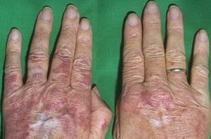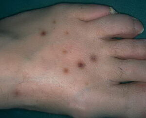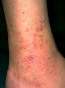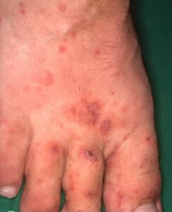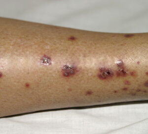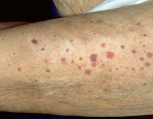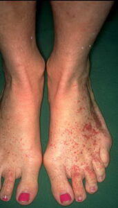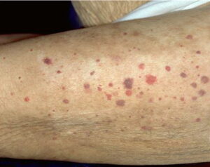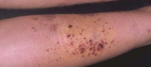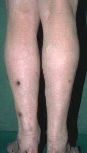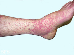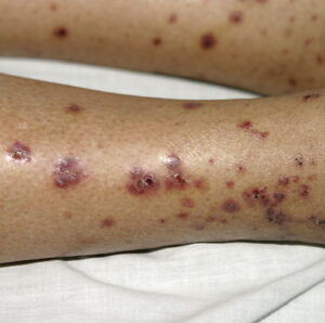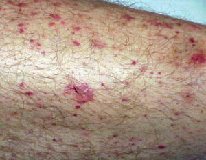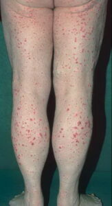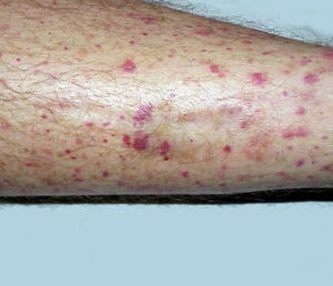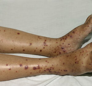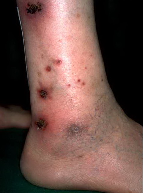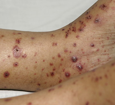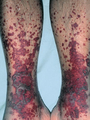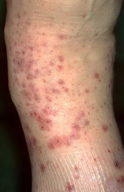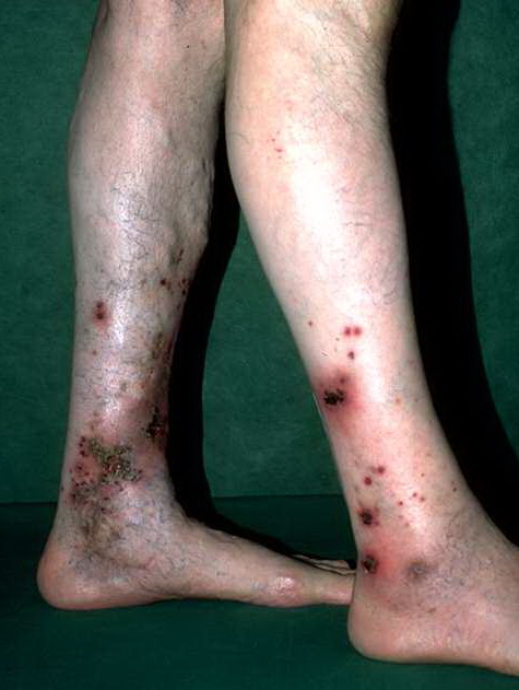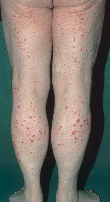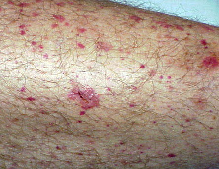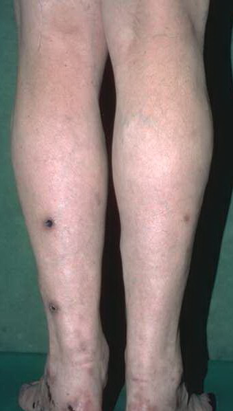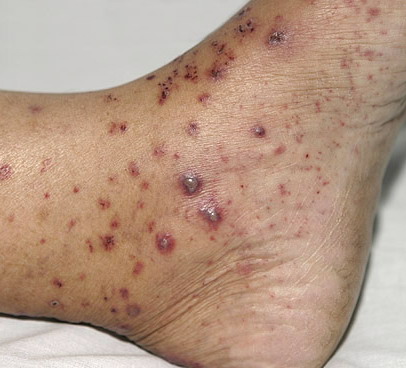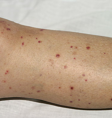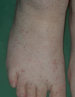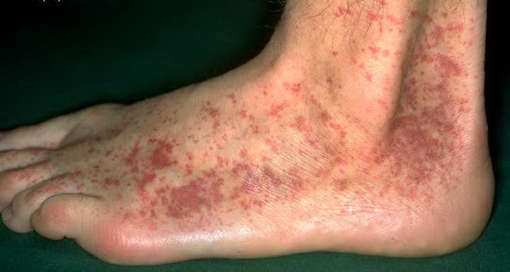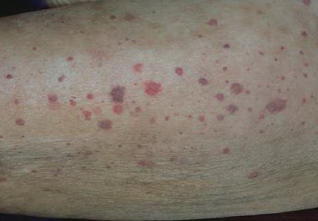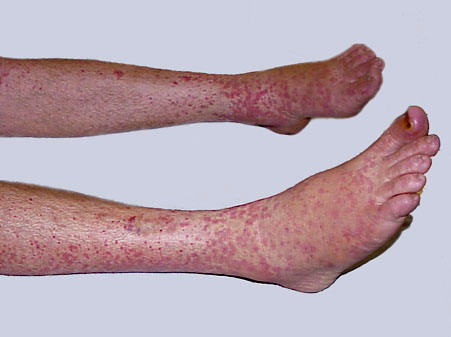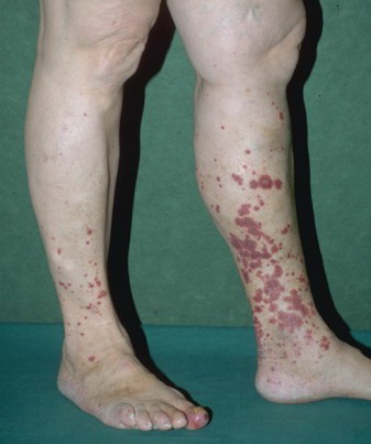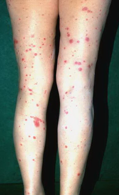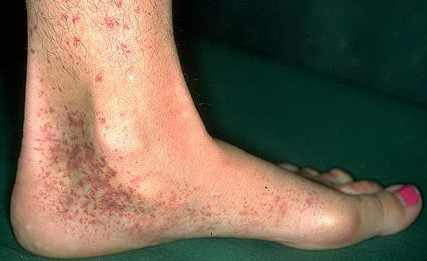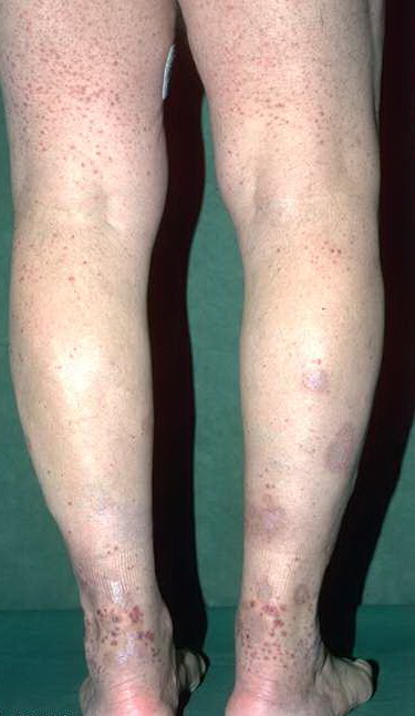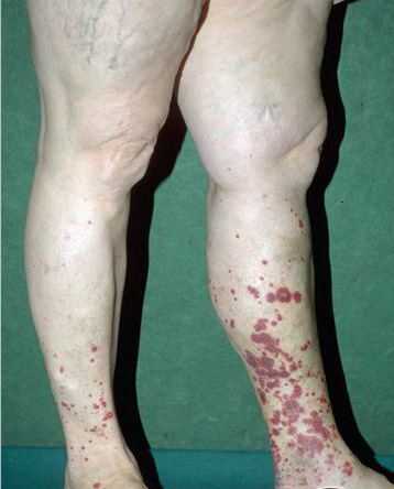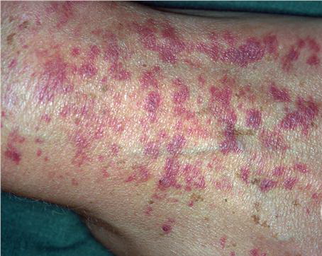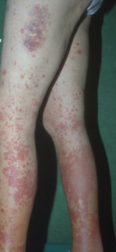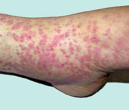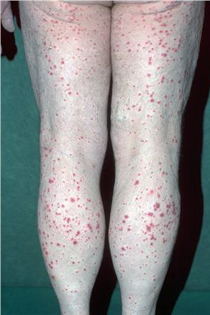 This disease involved only the skin, occur in young adults. General fatigue, joint symptoms such as muscle pain, a small number of cases may have irregular fever. Skin damage can be pleomorphic, with erythema, nodules, purpura, wind groups, blood blisters, papules, necrosis and ulcers. Knees for the most common to the two lower leg and foot up to the back skin lesions. More lesions are characterized by the beginning of purpura-like rash, pressure does not fade is the result of vessel wall inflammation and exudative cell infiltration, and they are high silt from the spot can be touched, is characteristic of allergic Cutaneous vasculitis. Some started to subcutaneous nodules, such as broad beans and soybeans to jujuba size, there is tenderness pink. Purpura may have started to complete the kind of lesions, and some may Erysipelas-like skin lesions began to change, and some may morphea-like changes, and some may like erythema multiforme. The development process in the skin lesions may be accompanied by the wind group, such as papules. As a result of severe inflammatory response in Henoch-Schonlein purpura and rash occurred in blood blisters, necrosis and ulcers, nodules as part of the damage may also occur with painful ulcers. Edema to the ankle and foot for the weight. More pronounced in the afternoon, accompanied by two lower limbs weakness. There are a variety of lesions of this disease, but almost every purpura or nodules. Neutral polynuclear leukocyte extravasation to the surrounding tissue can also occur when the pustules. Lesions can occur at any site, such as the back, upper limbs, buttocks, etc., the distribution was symmetrical. Lesions have a conscious pain, itching or burning sensation, and some without symptoms, and tenderness. After the lesions have more pigmentation and, if after the ulcer can become atrophic scars. Acute episode of disease, the damage to occur in batches, are widely distributed, with lower leg edema, severe illness. After damage from chronic, recurrent sustained a few months or years. Light lesions were 2 to 4 weeks may be more. Some lesions integration to become a large expansion of the damage around the knee, elbow and hands often, it seems erythema lasting performance uplift.