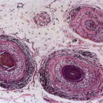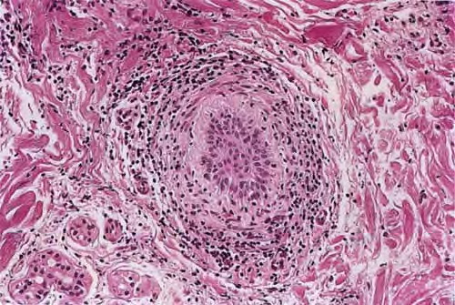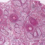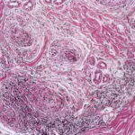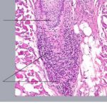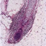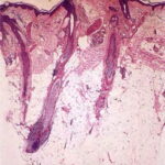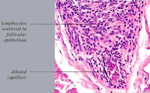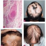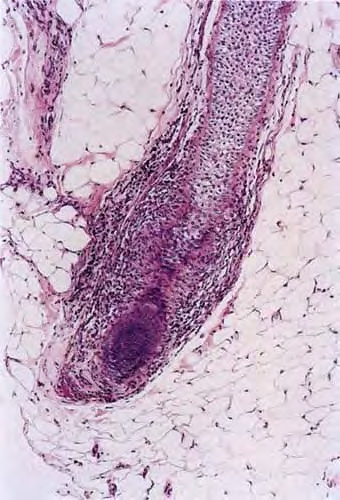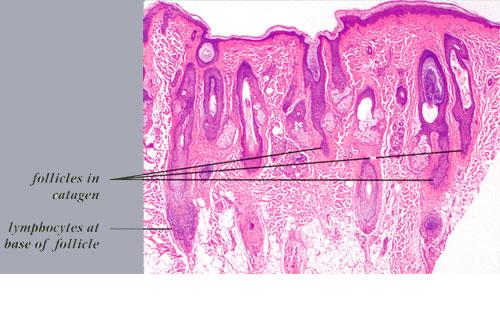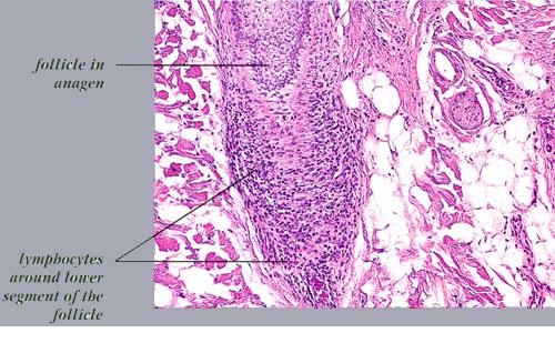 The diagnostic pathologic feature is peribulbar lymphocytic inflammation (“swarm of bees”) affecting anagen follicles or follicles in early catagen. The inflammatory assault on anagen follicles induces a premature conversion to catagen . Consequently, the number of catagen and telogen follicles found may be marked, approaching 100% . Follicles may enter a persistent phase of telogen in which the hair shaft has already been shed, manifested by the telogen germinal unit .As follicles enter catagen, the lymphocytic infiltrate may persist around the epithelial remnant of the receding follicle and also within and surrounding the collapsed follicular sheaths. Telogen hairs show little to no perifollicular inflammation.