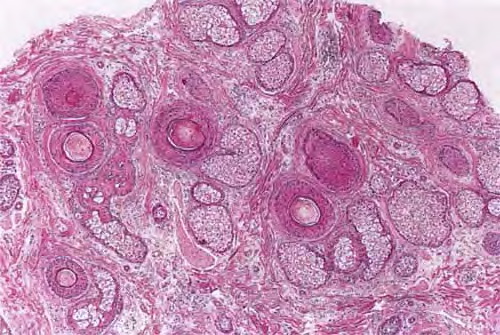 catagen, or telogen hairs, and in transverse sections they show only a minute, incompletely keratinized hair shaft or no shaft at all.