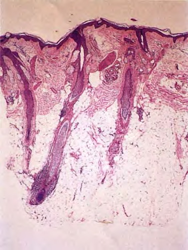 As telogen follicles reenter anagen, they again come under attack from pathogenic lymphocytes, which precipitate premature conversion to catagen once again, so that anagen duration becomes shorter and shorter and the follicles begin to miniaturize . As the follicles decrease in size they become situated more superficially, although often deeper than normal vellus hairs, with their bulbs situated in the mid to lower dermis . With disease chronicity, most of the hairs become miniaturized. Miniaturization and conversion to catagen and telogen leave many collapsed fibrous root sheaths in the subcutis.