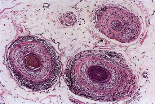 Some authors claim that in longstanding AA, the inflammatory infiltrates appear to diminish (203), whereas others believe that the degree of inflammation found on biopsy does not depend on disease duration, citing cases of longstanding AA that showed a great deal of inflammation (194). In a reappraisal of the histopathology of AA, Whiting suggested that the key factor in the histologic picture was the duration of the attack, with lymphocytes surrounding mainly terminal hair bulbs in acute episodes and involving mainly miniaturized hair bulbs in chronic, recurrent disease .