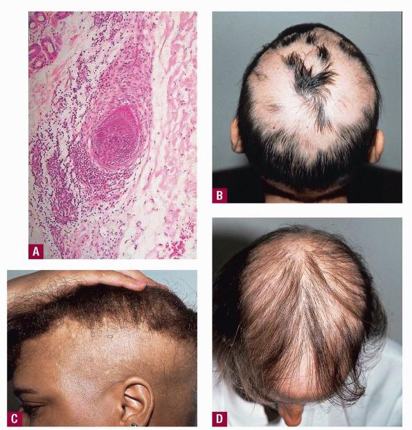 Alopecia areata (AA) is characterized clinically by complete or nearly complete absence of hair in one or more circumscribed areas of the scalp . Clinical inflammation, typically manifested by erythema, is not obvious, and the follicular openings are preserved, a clinical finding that allows the examiner to make the assessment of a nonscarring alopecia. In active areas of involvement, hair shedding is seen, as well as some short, fractured hair shafts, including the pathognomonic “exclamation point” hair. Complete scalp involvement (alopecia totalis) may ocur suddenly or through prolonged, progressive disease. Complete or nearly complete loss of all body hair (alopecia universalis) can also occur. Involvement of the eyebrows and eyelashes and regularly spaced pits on the surface of the nails may be seen. The majority of patients with localized disease undergo spontaneous resolution, but others show persistent disease, and a few patients have permanent hair loss. “The only predictable thing about the progress of alopecia areata is that it is unpredictable” , which means essentially that one cannot reliably predict which patients will have limited disease with spontaneous resolution and which will have recurrent disease or chronic, severe disease.