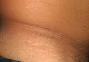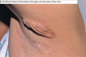 Mid-dermal elastolysis (MDE) usually consists of larger areas with diffuse wrinkling without herniation and with elastolysis limited to the mid-dermis.