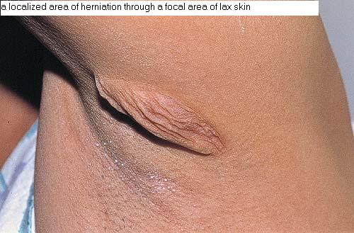 The predominant defect as revealed by elastic tissue stains is a focal partial or complete loss of elastic tissue in the papillary and/or mid-reticular dermis. There are usually some residual abnormal, irregular, and fragmented elastic fibers Presumably, the weakening of the elastic network leads to flaccidity and herniation. Direct immunofluorescence sometimes shows linear or granular deposits of immunoglobulins and complement along the dermal-epidermal junction or around the dermal blood vessels in affected skin Electron microscopy demonstrates that the elastic fibers are fragmented and irregular in appearance and occasionally can be engulfed by macrophages.