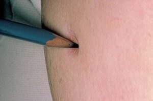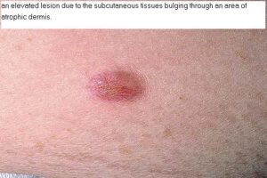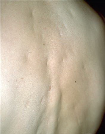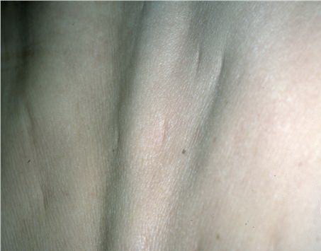 All types of anetoderma are characterized by a circumscribed loss of normal skin elasticity. The characteristic lesions are flaccid circumscribed areas of slack skin with the impression of loss of dermal substance forming depressions, wrinkling, or sac-like protrusions . These atrophic, skin-colored, or blue-white lesions are 5 to 30 mm in diameter. The number varies from a few to hundreds. The skin surface can be wrinkled, thinned, and often depigmented, and a central depression may be seen. Coalescence of smaller lesions can give rise to larger herniations. The examining finger sinks without resistance into a distinct pit with sharp borders as if into a hernia ring (buttonhole sign). The protrusion reappears as soon as the pressure from the finger is removed.