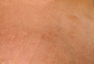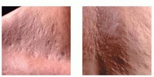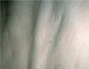 Papular elastorrhexis is an acquired disorder characterized by white, firm non-follicular papules measuring 1 to 3 mm, evenly scattered on the chest, abdomen, and back. It usually appears in adolescence or early adulthood. The pathology demonstrates focal degeneration of elastic fibers and normal collagen. There are no associated extra-cutaneous abnormalities. This is believed by some authors to be a variant of connective tissue nevi10 or an abortive form of the Buschke-Ollendorff syndrome,11 whereas others think that these represent papular acne scars.12 They are differentiated from anetoderma by being firm non-compressible lesions.
